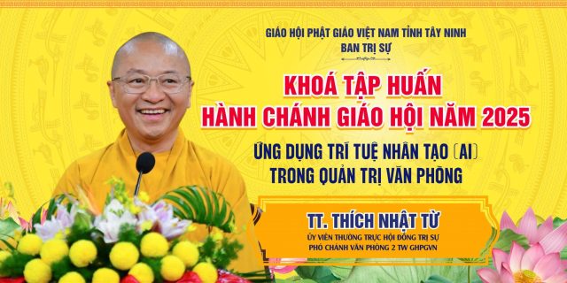 Sáng ngày 25/11/2025 (nhằm ngày 06/10/Ất Tỵ), trong ngày thứ hai của Khóa tập huấn Hành chánh Giáo hội năm 2025 do BTS GHPGVN tỉnh Tây Ninh tổ chức tại chùa Pháp Minh, xã Mỹ Hạnh, tỉnh Tây Ninh, TT. Thích Nhật Từ – Ủy viên Thường trực HĐTS, Phó Chánh Văn phòng II TW GHPGVN đã quang lâm thuyết giảng với chủ đề: “Ứng dụng trí tuệ nhân tạo (AI) trong quản trị văn phòng”.