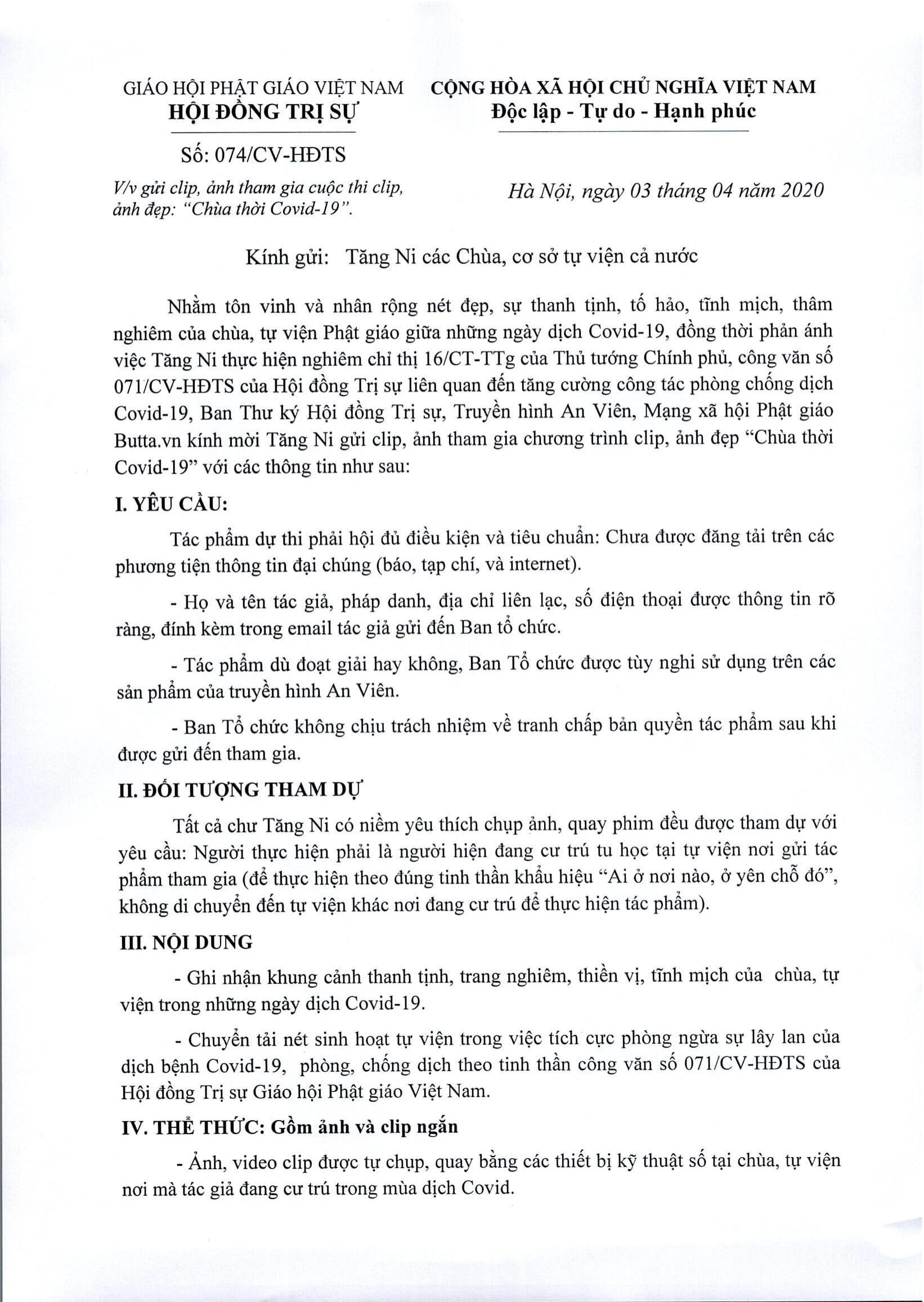 Công văn nêu rõ, nhằm tôn vinh và nhân rộng nét đẹp, sự thanh tịnh, tố hảo, tĩnh mịch, thâm nghiêm của chùa, tự viện Phật giáo giữa những ngày dịch Covid-19, đồng thời phản ánh việc Tăng Ni thực hiện nghiêm chỉ thị 16/CT-TTg của Thủ tướng Chính phủ, công văn số 071/CV-HĐTS của HĐTS liên quan đến tăng cường công tác phòng chống dịch Covid-19, Ban Thư ký HĐTS, truyền hình An Viên, mạng xã hội Phật giáo Butta.vn kính mời Tăng Ni gửi clip, ảnh tham gia cuộc thi clip, ảnh đẹp “Chùa thời Covid-19”.
