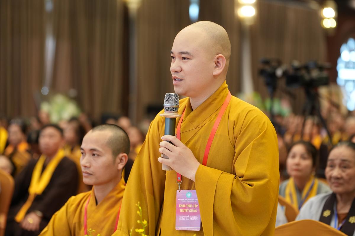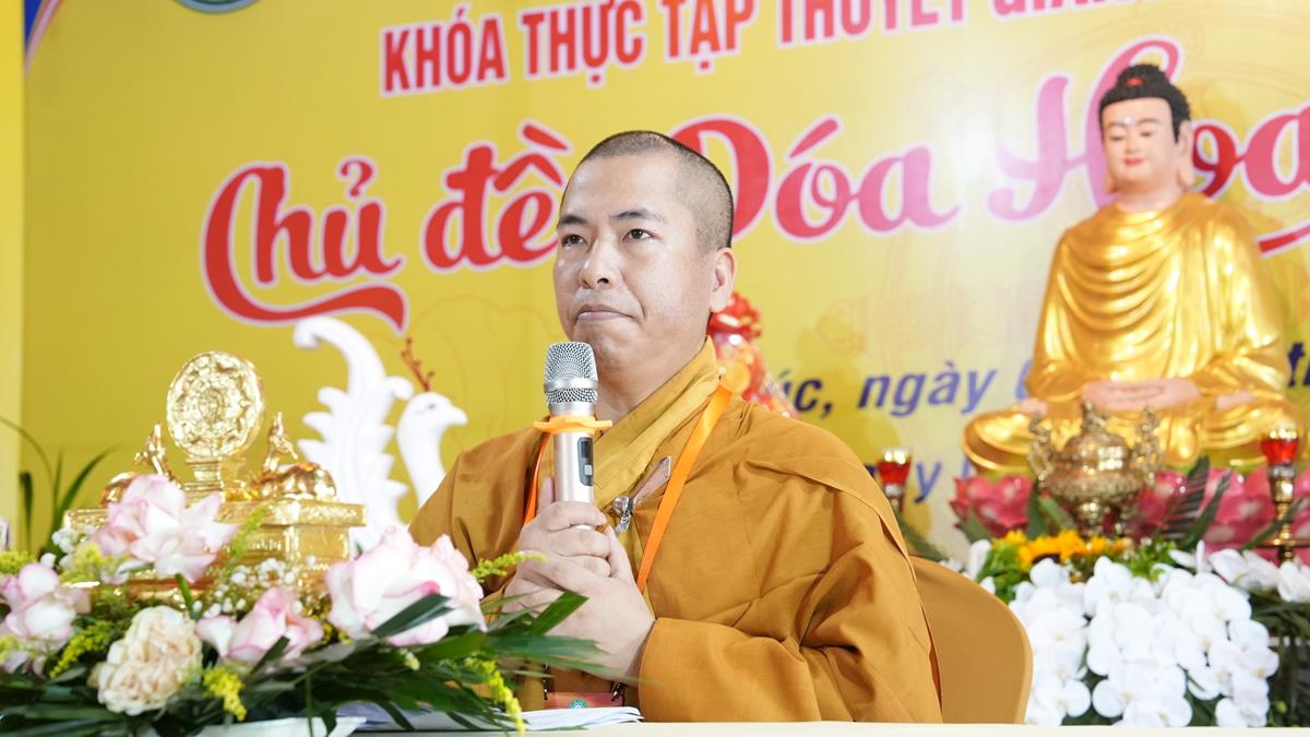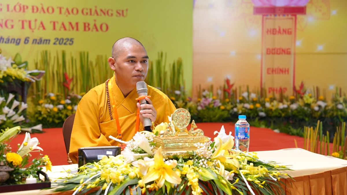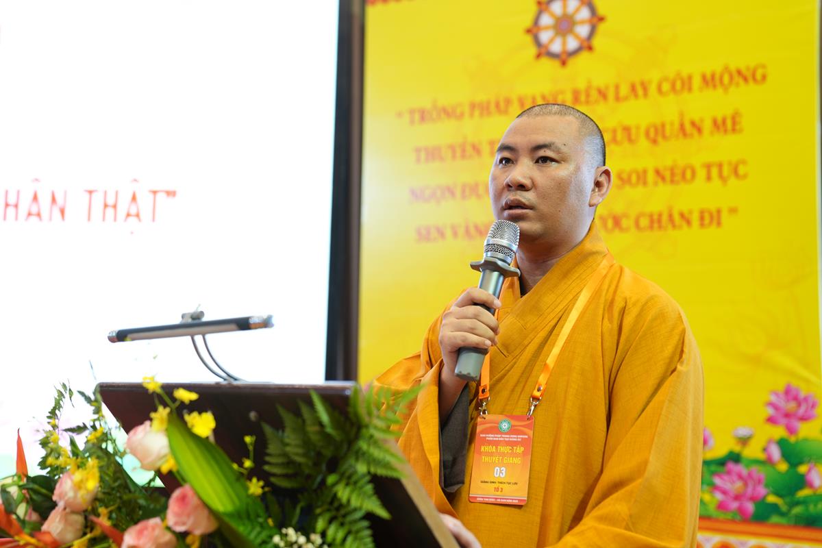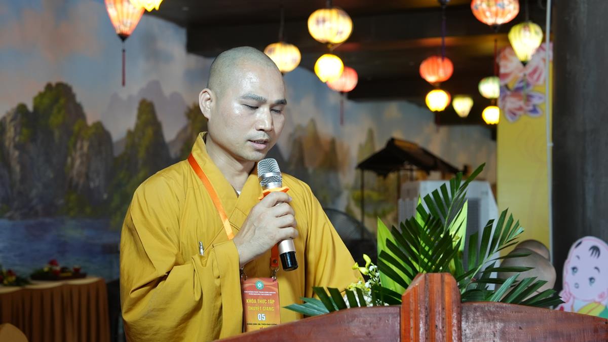 Sau khoảng thời gian lắng đọng vào các đề tài tọa đàm khoa học mang nhiều ý nghĩa sâu sắc, chư Tăng Ni Giảng sinh của các tổ lại tiếp tục thực tập thuyết giảng, đem chính pháp đi vào đời sống qua từng câu chuyện, từng đề tài cụ thể. Tại Tổ 1, Đại đức Thích Thanh Quang đã chia sẻ bài pháp “Một lòng hướng Phật”, nhấn mạnh rằng việc giữ tâm luôn quay về Tam Bảo là nền tảng vững chắc cho đời sống an lạc trong hiện tại và tương lai. Đại đức khuyến khích hành giả ba điều: Tín tâm – Niềm tin vững chắc nơi Phật pháp, Chính niệm – Nhận diện tâm mình trong từng phút giây, Hành trì đều đặn – Tu tập như trồng cây. Với lời dạy sâu sắc: “Mỗi ngày một chút – lâu ngày thành nhiều”, giảng sinh nhấn mạnh rằng tu tập không phải đợi khi rảnh rỗi, mà chính là học cách tạo thời gian để quay về với Phật trong từng khoảnh khắc sống.