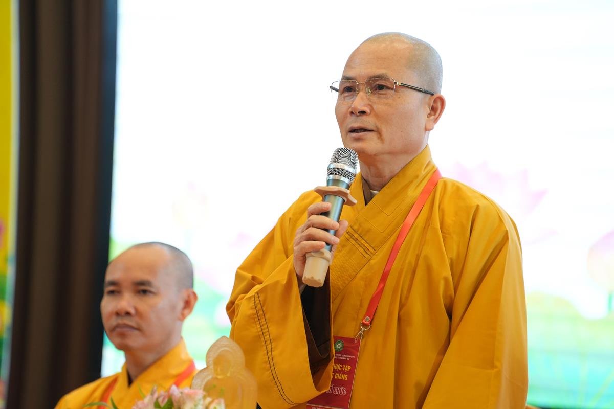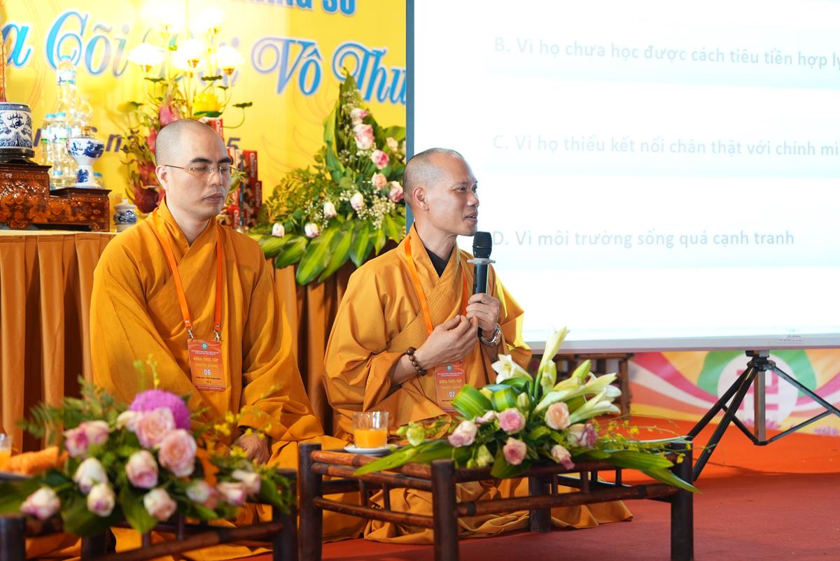 Dòng mạch ấy tiếp tục tuôn chảy sang không gian tu học của Tổ 2, nơi chủ đề “Trí tuệ Phật giáo trong đời sống hiện đại phát triển bền vững” được thảo luận một cách sôi nổi và đầy nhiệt tâm. Tọa đàm dưới sự chứng minh của Thượng tọa Thích Chiếu Tuệ – Ủy viên HĐTS, Phó trưởng Ban thường trực Ban Hoằng pháp TƯ GHPGVN, Trưởng ban Điều hành lớp Cao cấp giảng sư khu vực phía Bắc; Thượng tọa Thích Chúc Tiếp – Ủy viên HĐTS, Phó Ban Hoằng pháp TƯ GHPGVN, Phó ban Điều hành lớp Cao cấp Giảng sư khu vực phía Bắc. Qua các bài tham luận, có thể thấy rõ Trí tuệ không chỉ là nhận thức, mà còn là hành động – khi mỗi cá nhân học được cách chuyển hóa khổ đau, nuôi dưỡng hạnh phúc chân thật, đồng thời ý thức sâu sắc về sự tương tức giữa thân – tâm – môi trường sống, từ đó thúc đẩy hành động thiết thực bảo vệ môi trường một cách hiệu quả và bền vững.