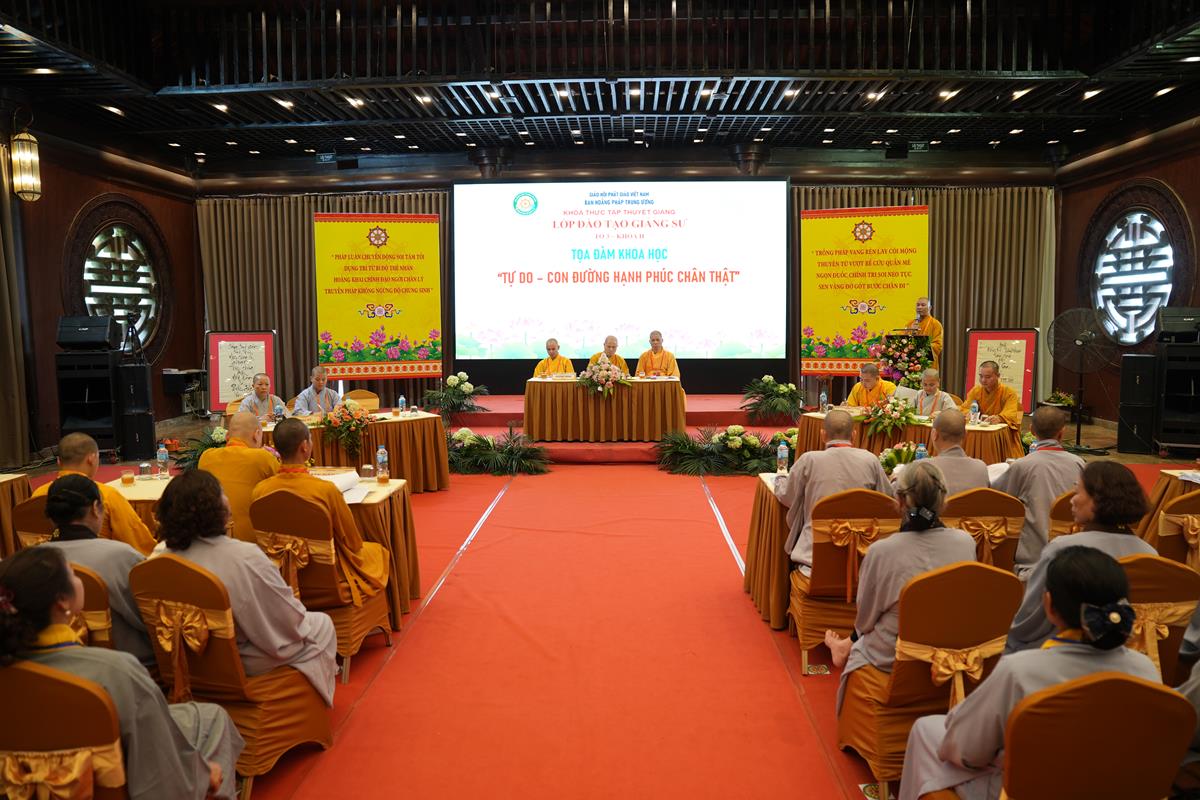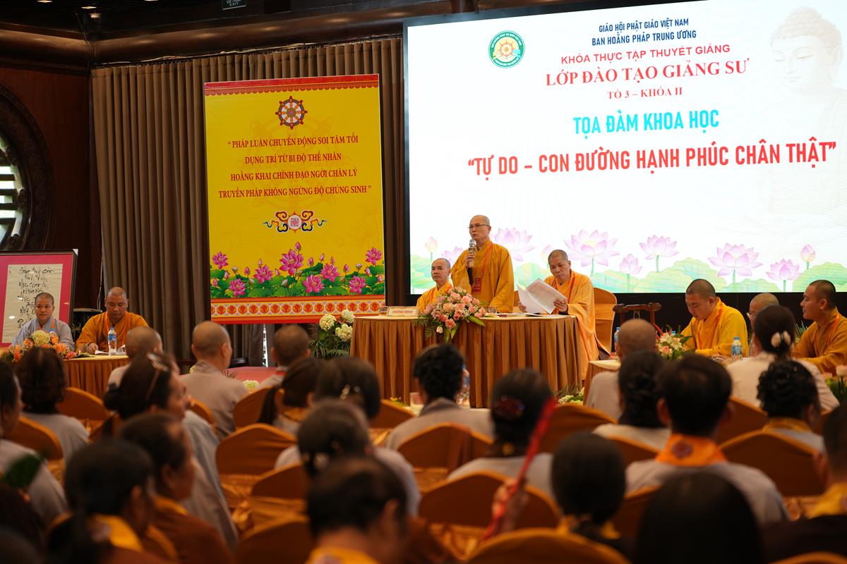 Tại Tổ 3, dưới sự chứng minh của Thượng tọa Thích Minh Thuận – Ủy viên HĐTS, Phó trưởng Ban Hoằng pháp TW; Thượng tọa Thích Trí Thuần – Phó thư ký kiêm Chánh văn phòng ban Hoằng pháp TƯ khu vực phía Bắc, Phó ban Điều hành lớp Cao cấp Giảng sư khu vực phía Bắc, Đại đức Thích Thanh Hòa – Phó ban Hoằng pháp GHPGVN TP Hà Nội cùng chư Tôn đức Tăng Ni Ban điều hành Lớp đào tạo Giảng sư khu vực phía Bắc, buổi tọa đàm với chủ đề “Tự do – Con đường hạnh phúc chân thật” mở ra không gian của quán chiếu: khi không còn bị chi phối bởi giận dữ, ham muốn hay sợ hãi, ta mới thật sự được tự do. Tự do không đến từ việc chạy trốn cuộc sống, mà từ khả năng an trú giữa muôn vàn sóng gió mà vẫn giữ được tâm tĩnh lặng như mặt hồ. Đây là một chủ đề mang ý nghĩa triết lý sâu sắc, không chỉ phản ánh chiều sâu tư tưởng Phật học, mà còn chạm đến những khắc khoải, thao thức của con người hiện đại trong hành trình đi tìm ý nghĩa sống giữa một thế giới đầy biến động.