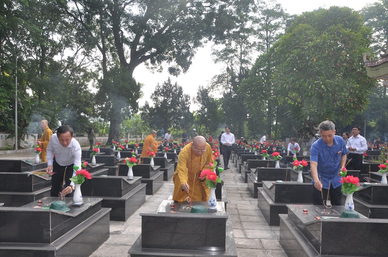 Trong không gian trầm mặc và trang nghiêm, chư tôn đức cùng đại biểu và phật tử đã dâng hương, dâng hoa tưởng niệm, tụng kinh cầu siêu, hồi hướng công đức cho hương linh các Anh hùng Liệt sĩ được siêu sinh về cõi an lành.