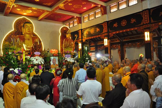 Tại Chánh điện tổ đình Vĩnh Nghiêm, Chư Tôn giáo phẩm lãnh đạo Giáo hội đối trước giác đài cố HT Thích Minh Hiền dâng hương tưởng niệm.