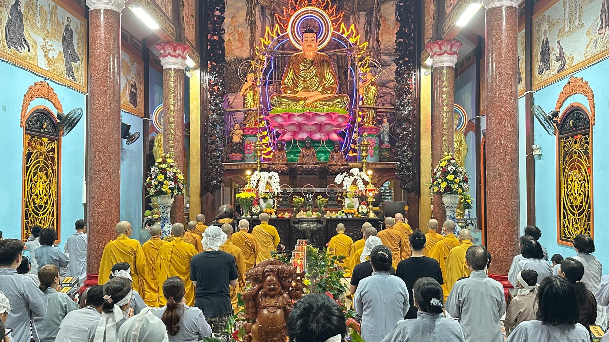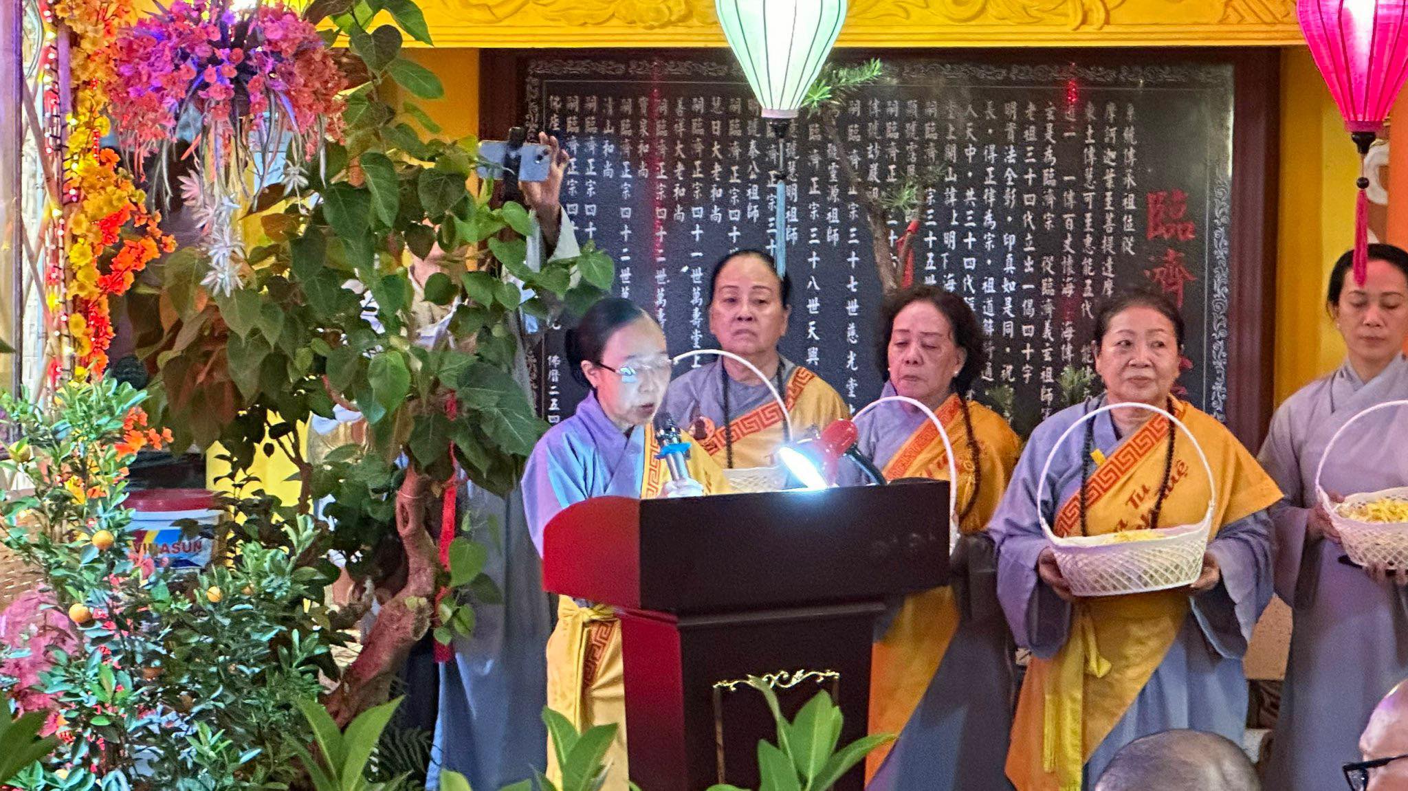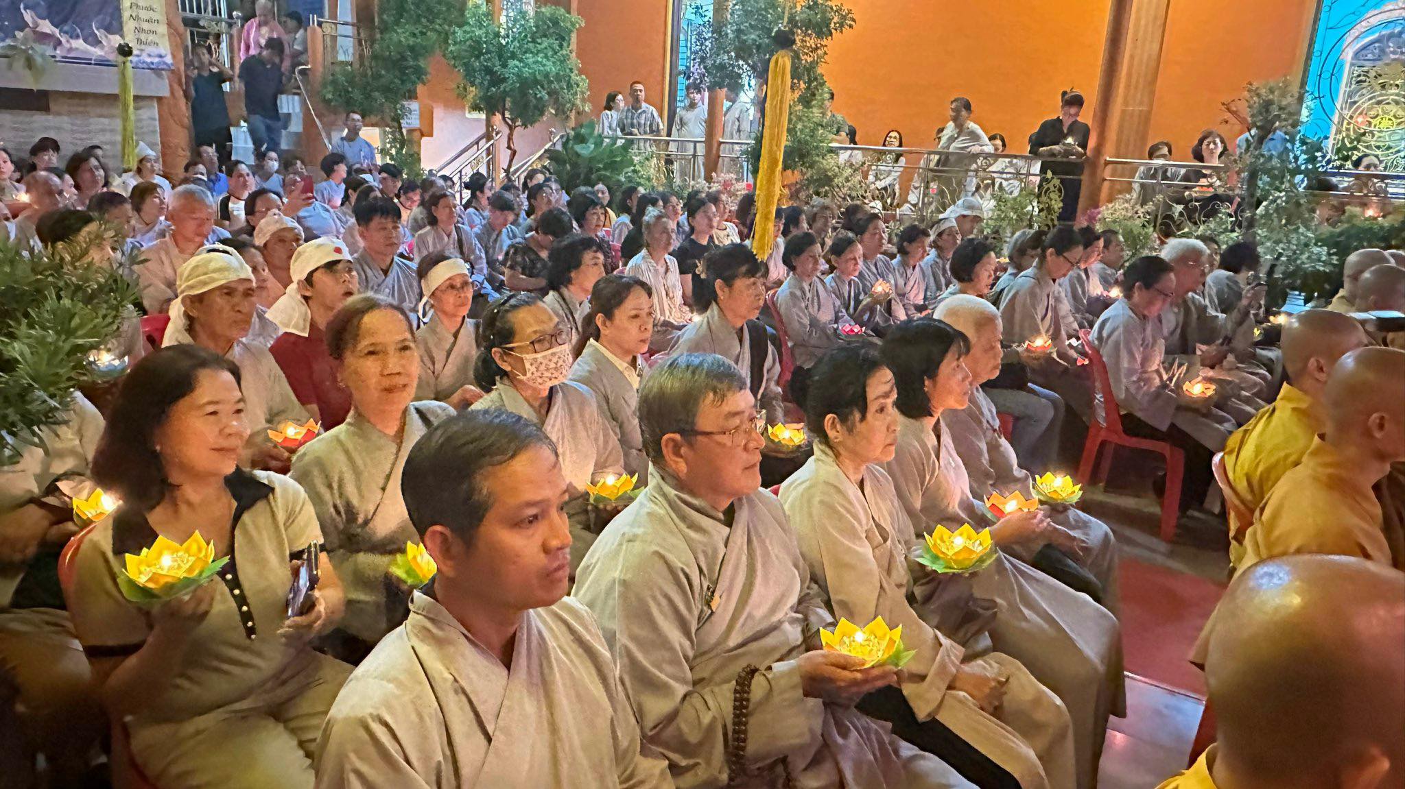 Tại Chánh điện chư tôn Đức đã thành kính dâng hương bạch Phật sau đó toàn thể chư Tăng và Phật tử cùng tụng thời kinh Bổn Môn Pháp Hoa (tại chánh điện) sau đó dưới sự hướng dẫn của Thượng tọa chứng minh, chưu Tăng và Phật tử nhiễu hoa đăng dâng Phật (tại lễ đài lộ thiên).