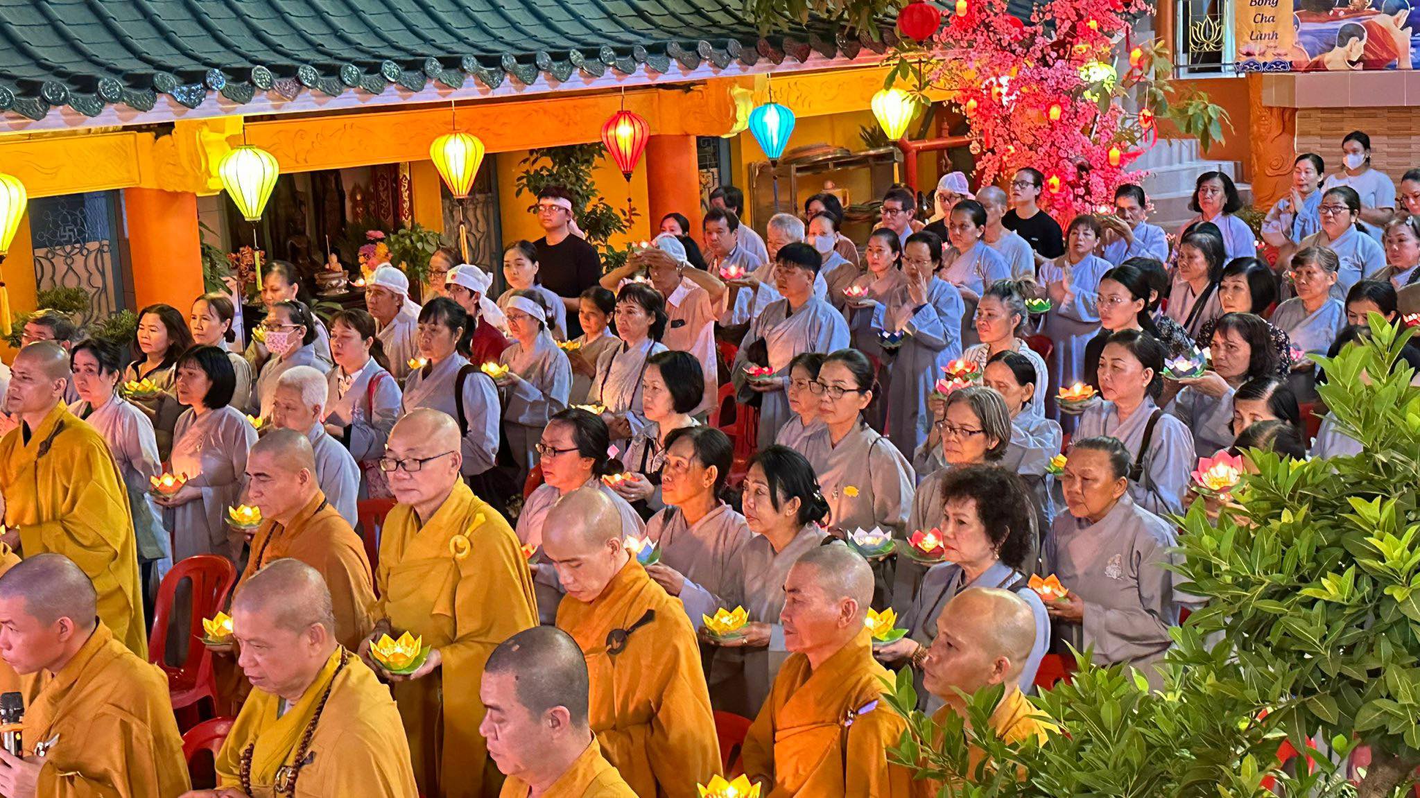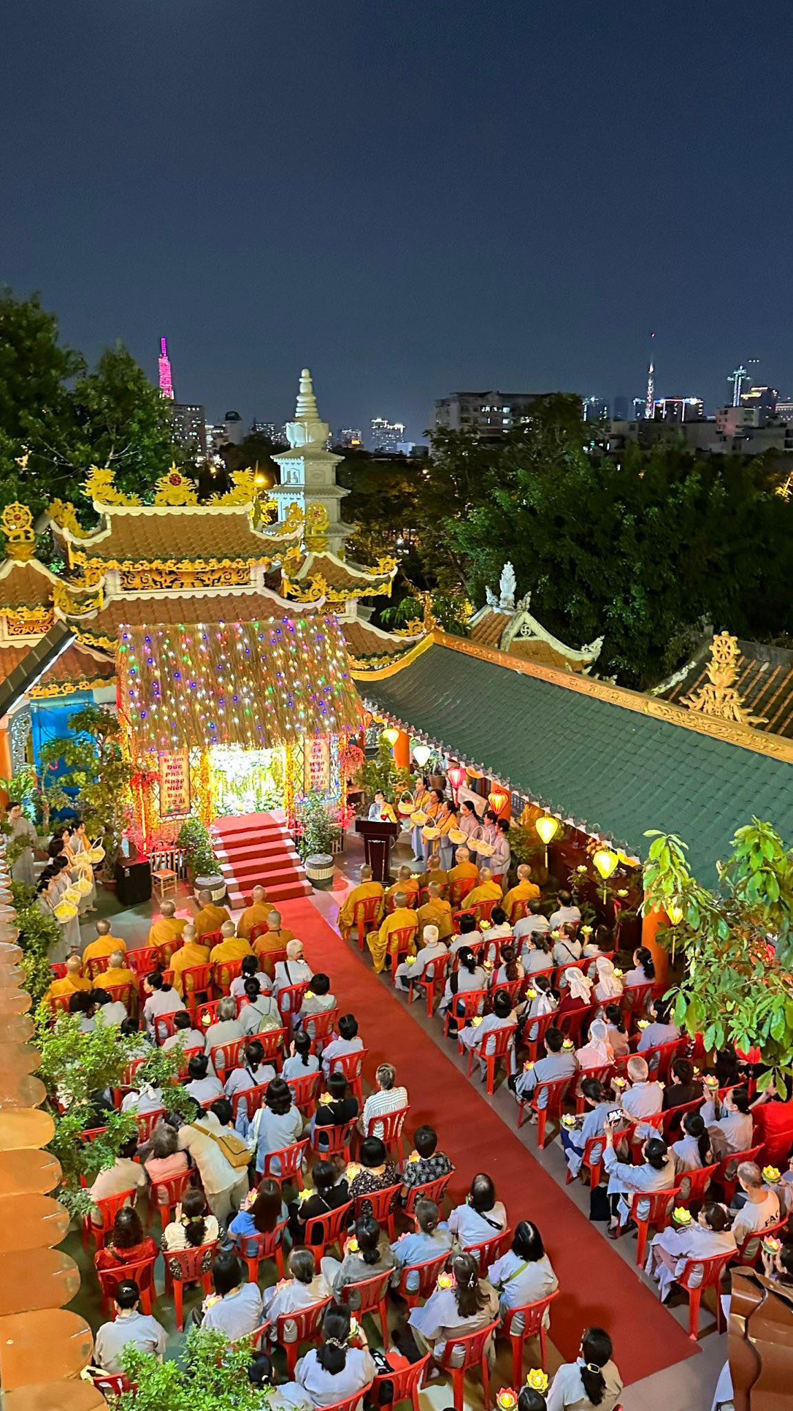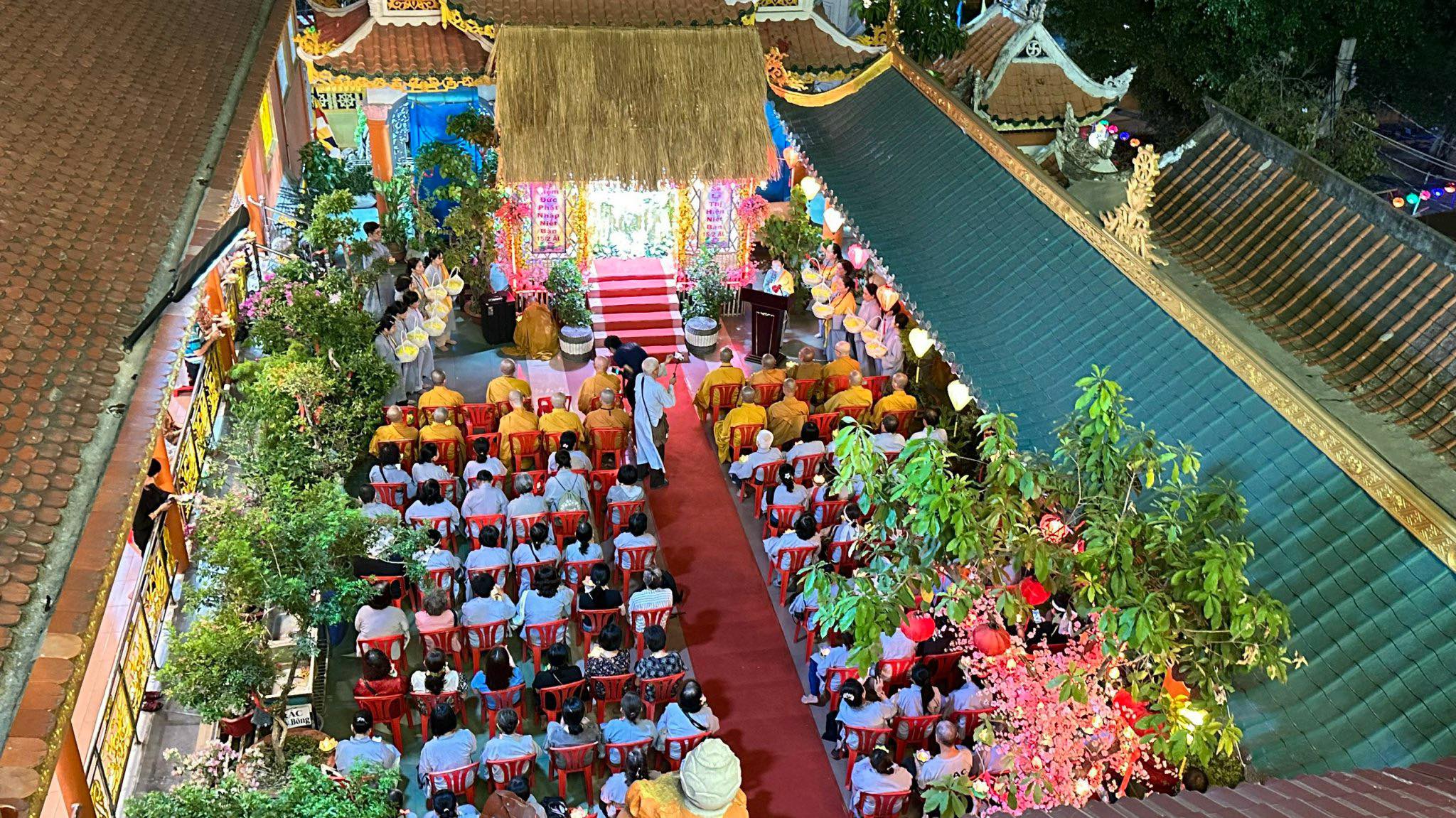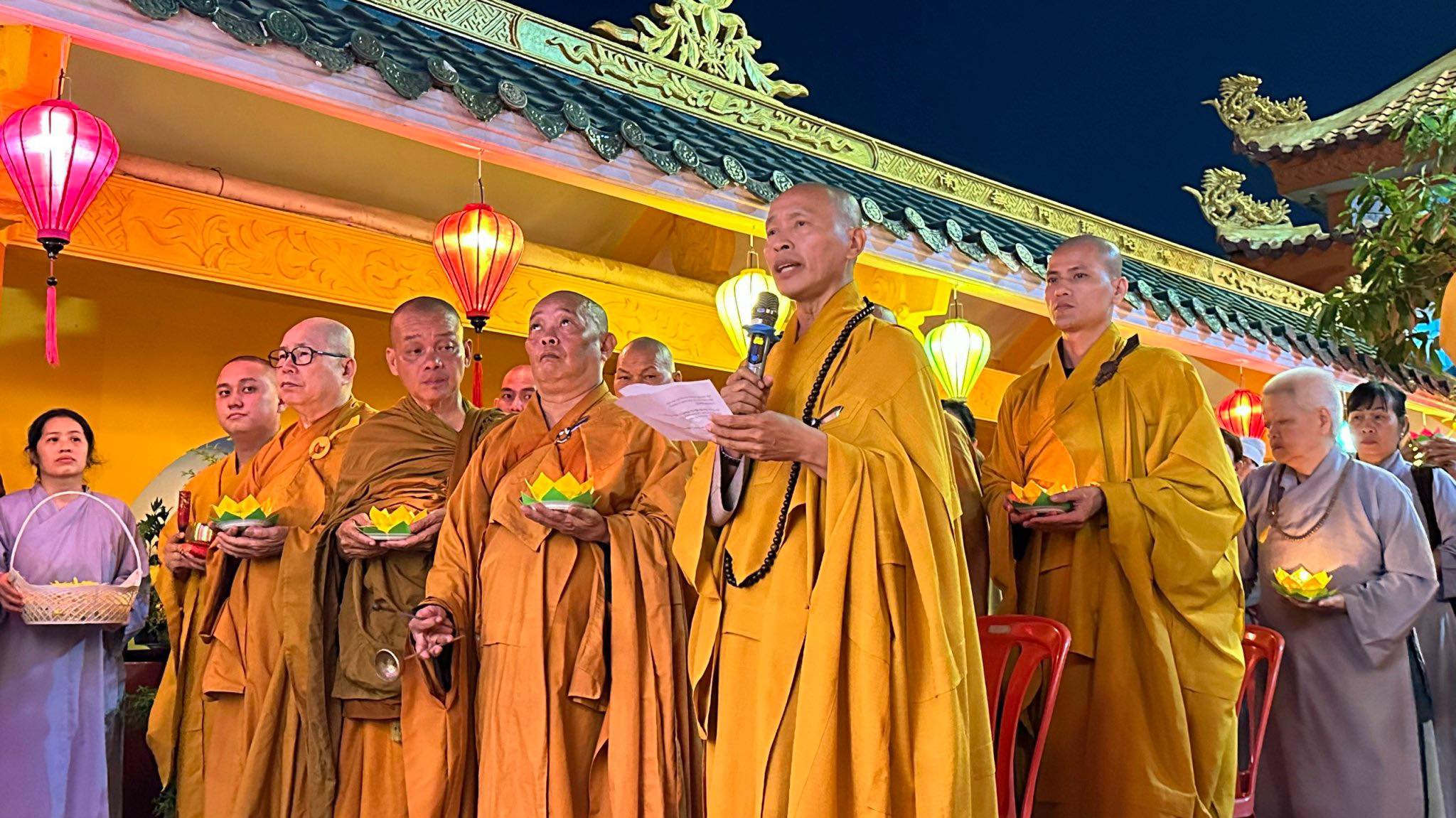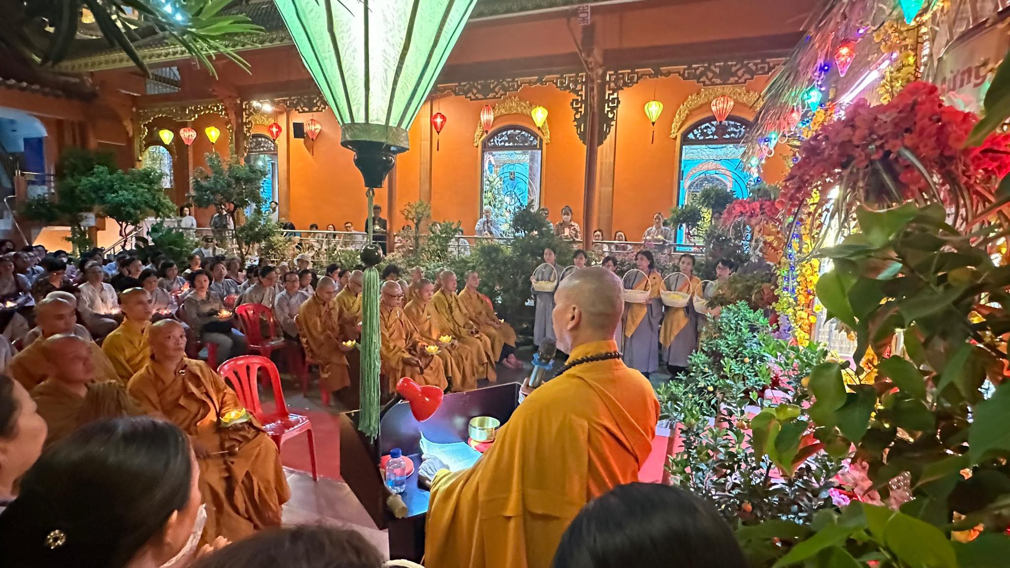 Tại Chánh điện chư tôn Đức đã thành kính dâng hương bạch Phật sau đó toàn thể chư Tăng và Phật tử cùng tụng thời kinh Bổn Môn Pháp Hoa (tại chánh điện) sau đó dưới sự hướng dẫn của Thượng tọa chứng minh, chưu Tăng và Phật tử nhiễu hoa đăng dâng Phật (tại lễ đài lộ thiên).