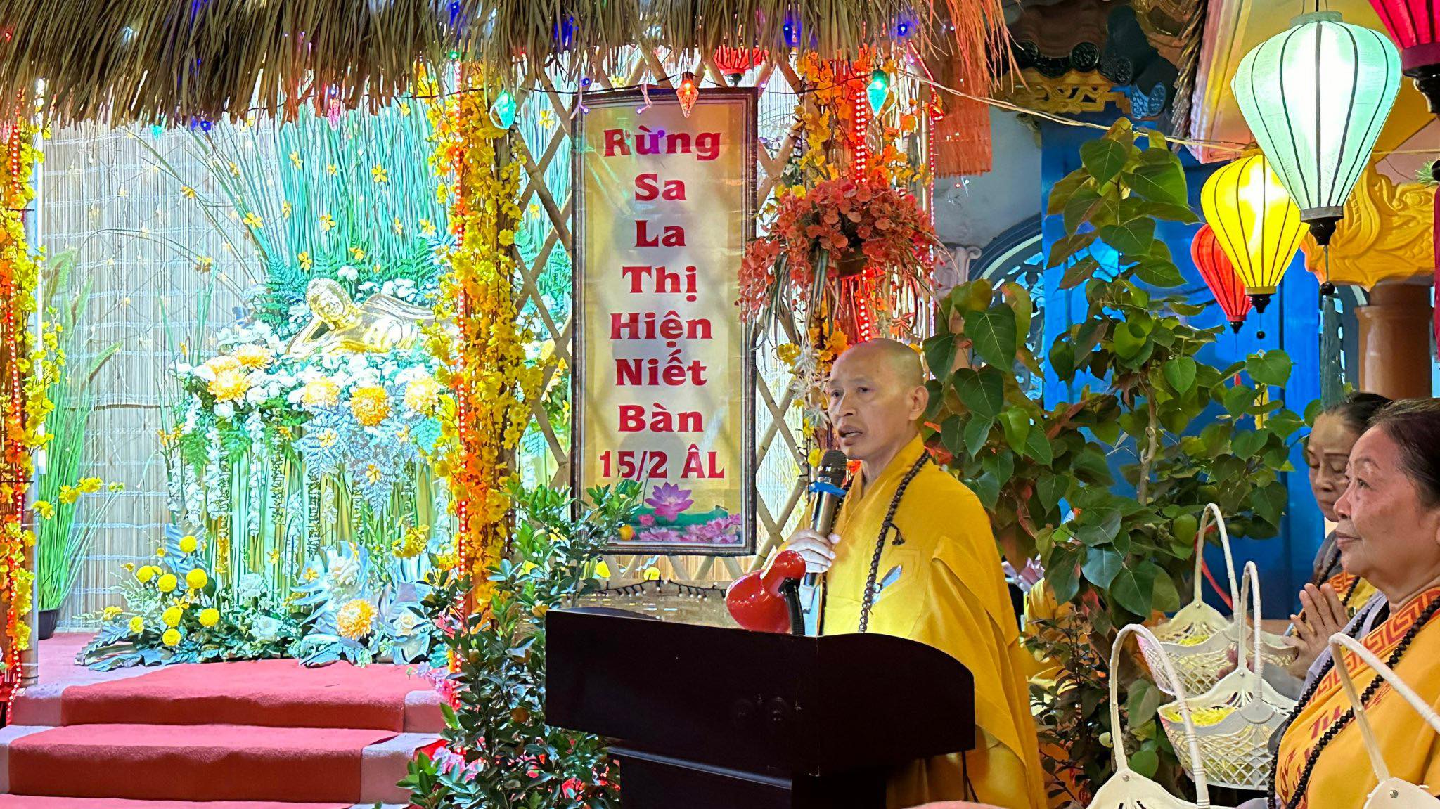 Đại diện chư Tăng, Phật tử Diệu Liên đọc lời tưởng niệm Phật Niết Bàn sau 49 năm thuyết pháp độ sanh, cách đây hơn 25 thế kỷ, vào ngày Rằm tháng 2, nơi rừng Sala, xứ Câu Thi Na, đức Phật Thích Ca Mâu Ni đã thị hiện Niết bàn.