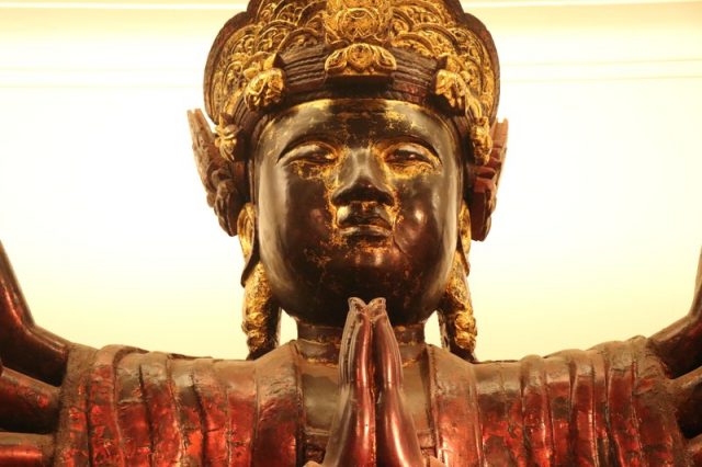 | Những cánh tay cầm pháp khí tỏa sang hai bên đầy tinh tế của bức tượng Phật Bà Quan Âm tại chùa Hội Hạ.