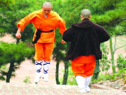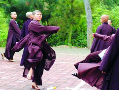 Ni sinh Thích Nữ Khánh Thảo – người có thâm niên gần 20 năm luyện võ, chủ nhiệm câu lạc bộ võ thuật của học viện – trong một buổi tập thể lực trên đường lên núi Sóc