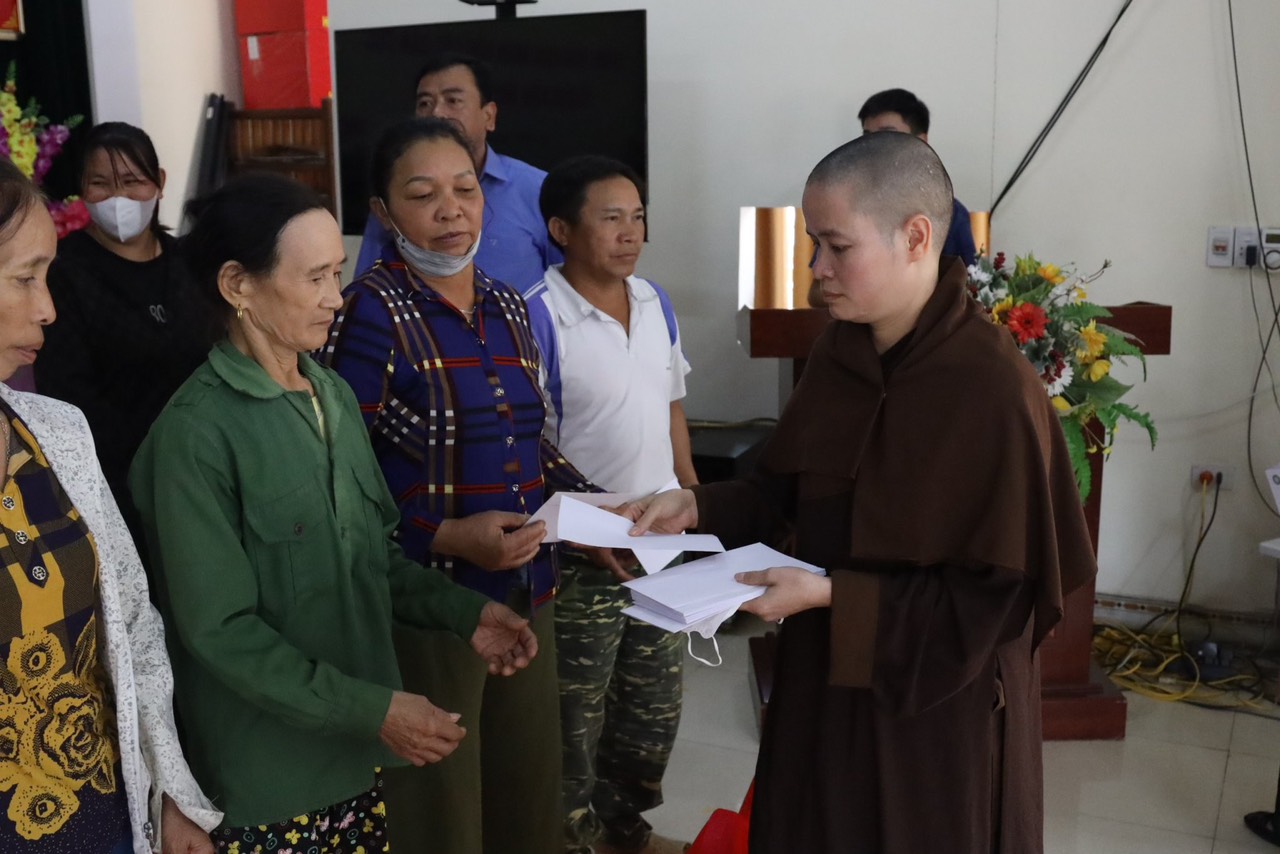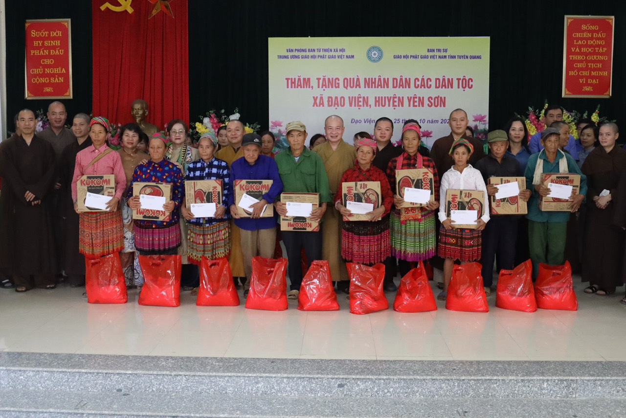 Chư tôn đức Văn phòng Ban Từ thiện – Xã hội và BTS GHPGVN tỉnh Tuyên Quang trao quà cho bà con