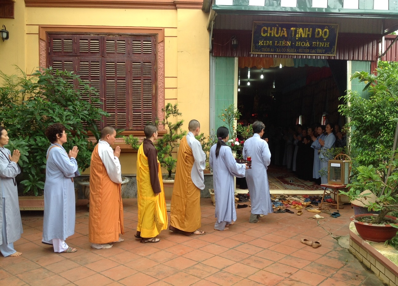 Từ đầu làng cờ phướng Phật giáo đã bay phất phới trong nắng gió miền trung du. Nhưng khi bước xuống xe tôi không khỏi một thoáng thất vọng, vì đây không phải là một ngôi chùa như tôi nghĩ, mà là một tư gia của Phật tử. Tuy nhiên trong suốt quá trình khóa tu một ngày ở đây, cảm giác ban đầu của tôi hoàn toàn thay đổi, tôi rất hứng thú với hình thức sinh hoạt Phật giáo này. Tôi nghĩ cần ghi ra đây một số vấn đề mà tôi đã thấy, cũng như một số đề xuất cho việc hoằng pháp.