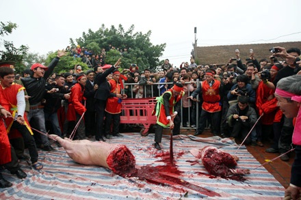 Qua những hình ảnh trong lễ hội bức tử lợn hay chém lợn mà giới truyền thông chuyển tải đã sôi động trên mạng internet chuyện mùa xuân hàng năm nơi này lại bức tử lợn tại địa phương. Người ta thấy có các phụ nữ với trang phục truyền thống quý phái Việt Nam với nét mặt hoan hỷ như một vinh hạnh đi bên khung gỗ chở con lợn sắp đến giờ lên “Đoạn đầu đài” một cách oan uổng chỉ biết kêu ai oán xé ruột sóc óc mà không biết van xin như con người. Và những người mang trang phục của “liền anh, liền chị” micro trong tay véo von làn điệu dân tộc, nét mặt rạng  rỡ