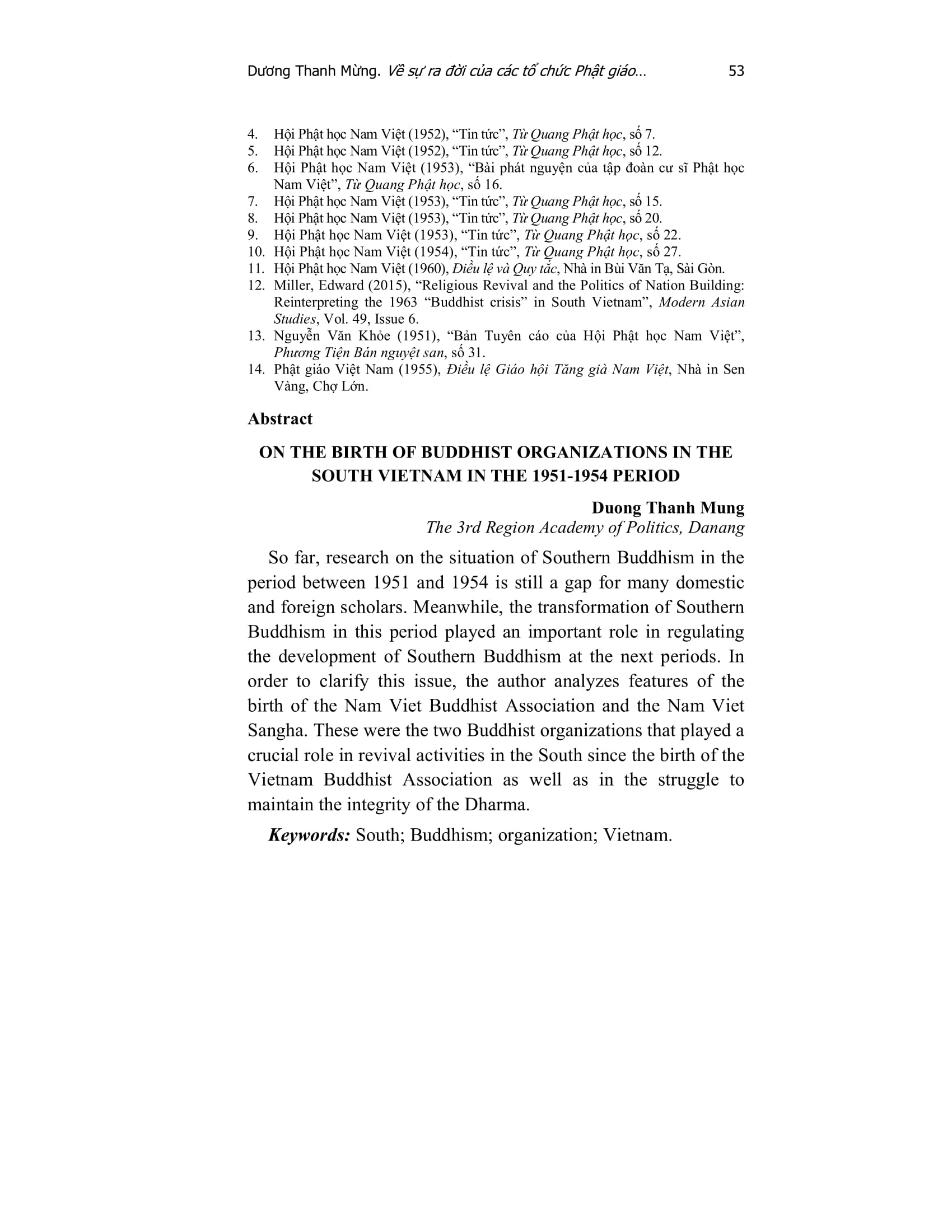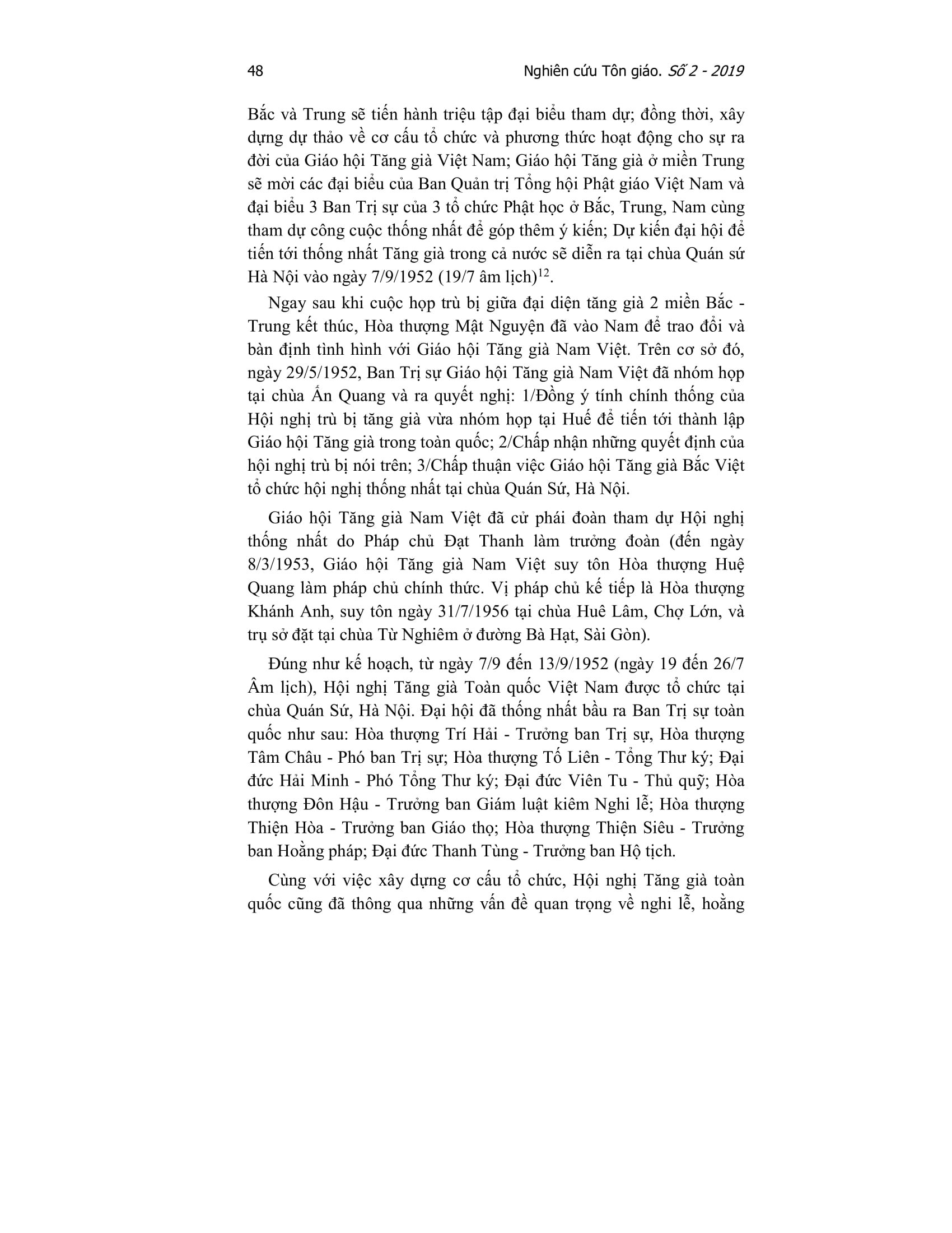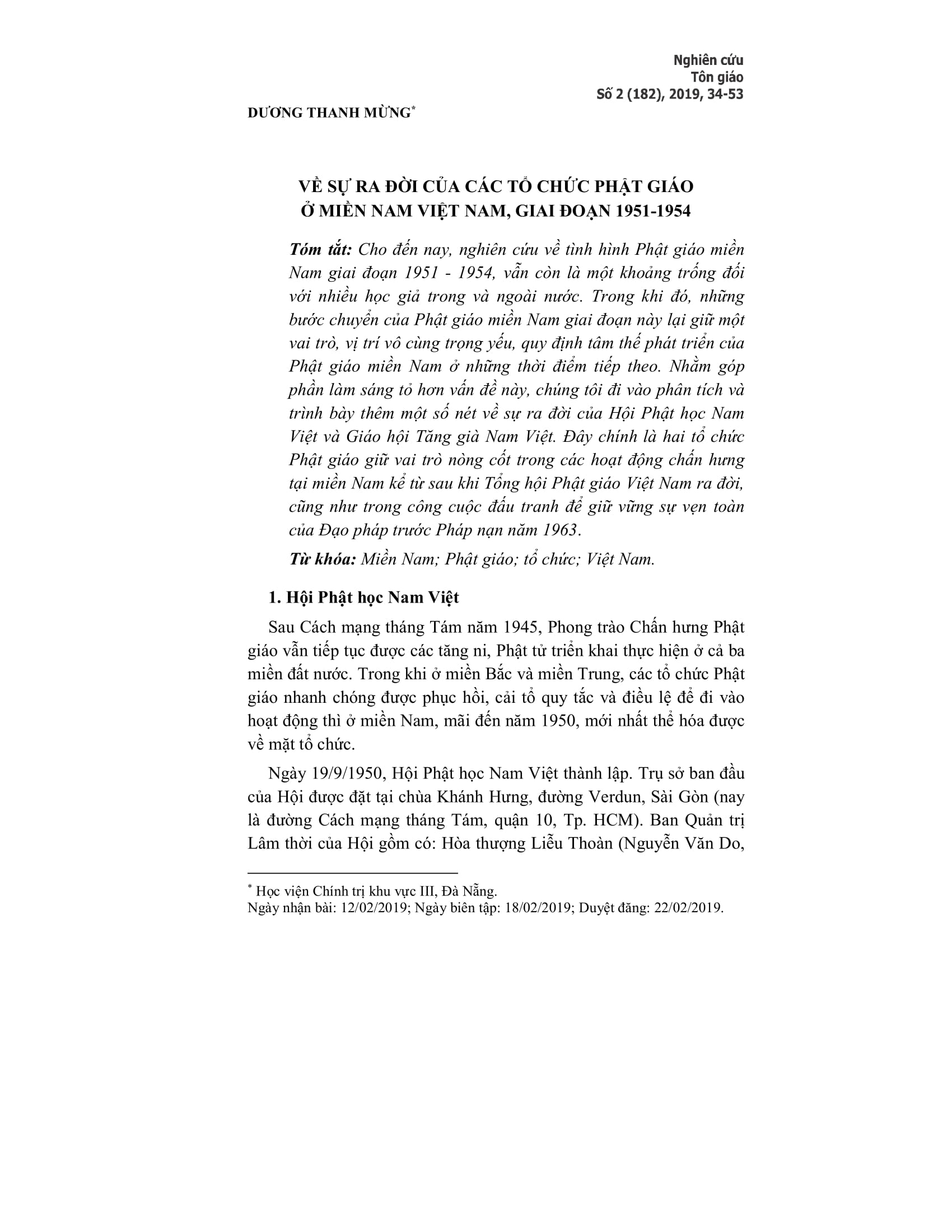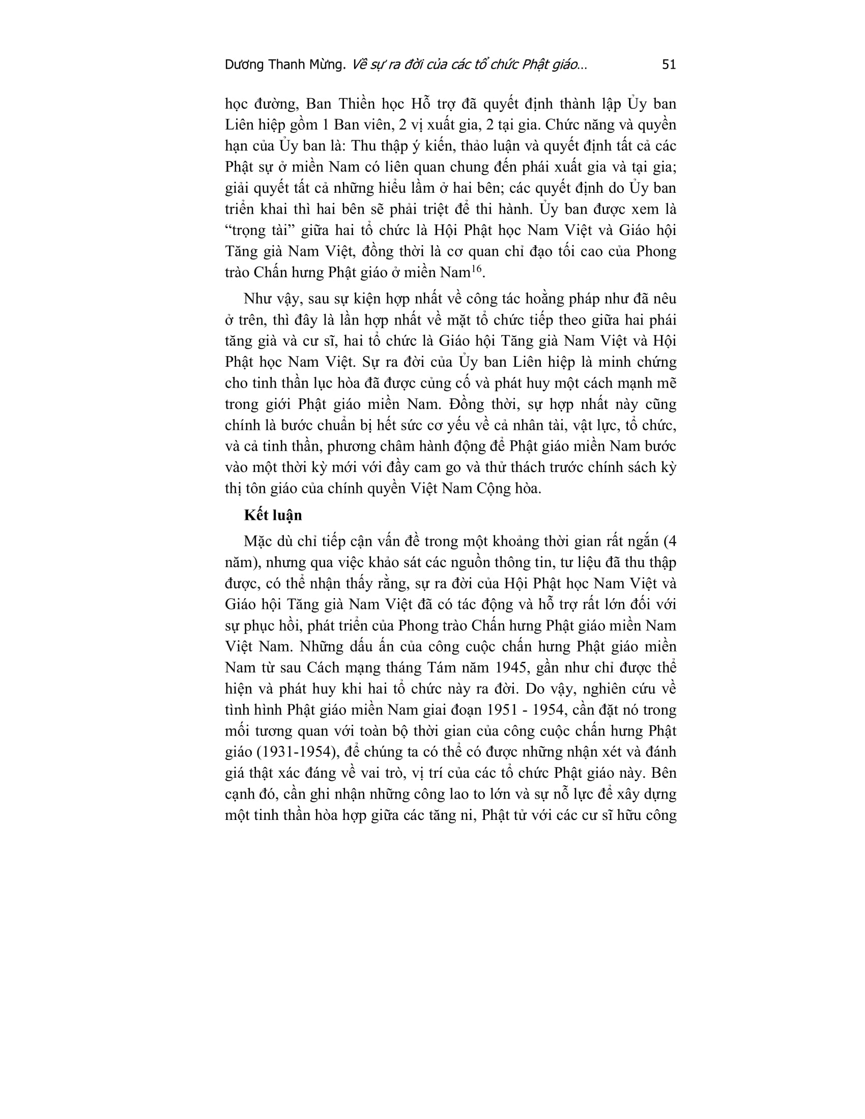 Cho đến nay, nghiên cứu về tình hình Phật giáo miền Nam giai đoạn 1951 – 1954, vẫn còn là một khoảng trống đối với nhiều học giả trong và ngoài nước. Trong khi đó, những bước chuyển của Phật giáo miền Nam giai đoạn này lại giữ một vai trò, vị trí vô cùng trọng yếu, quy định tâm thế phát triển của Phật giáo miền Nam ở những thời điểm tiếp theo. Nhằm góp phần làm sáng tỏ hơn vấn đề này, chúng tôi đi vào phân tích và trình bày thêm một số nét về sự ra đời của Hội Phật học Nam Việt và Giáo hội Tăng già Nam Việt. Đây chính là hai tổ chức Phật giáo giữ vai trò nòng cốt trong các hoạt động chấn hưng tại miền Nam kể từ sau khi Tổng hội Phật giáo Việt Nam ra đời, cũng như trong công cuộc đấu tranh để giữ vững sự vẹn toàn của Đạo pháp trước Pháp nạn năm 1963.