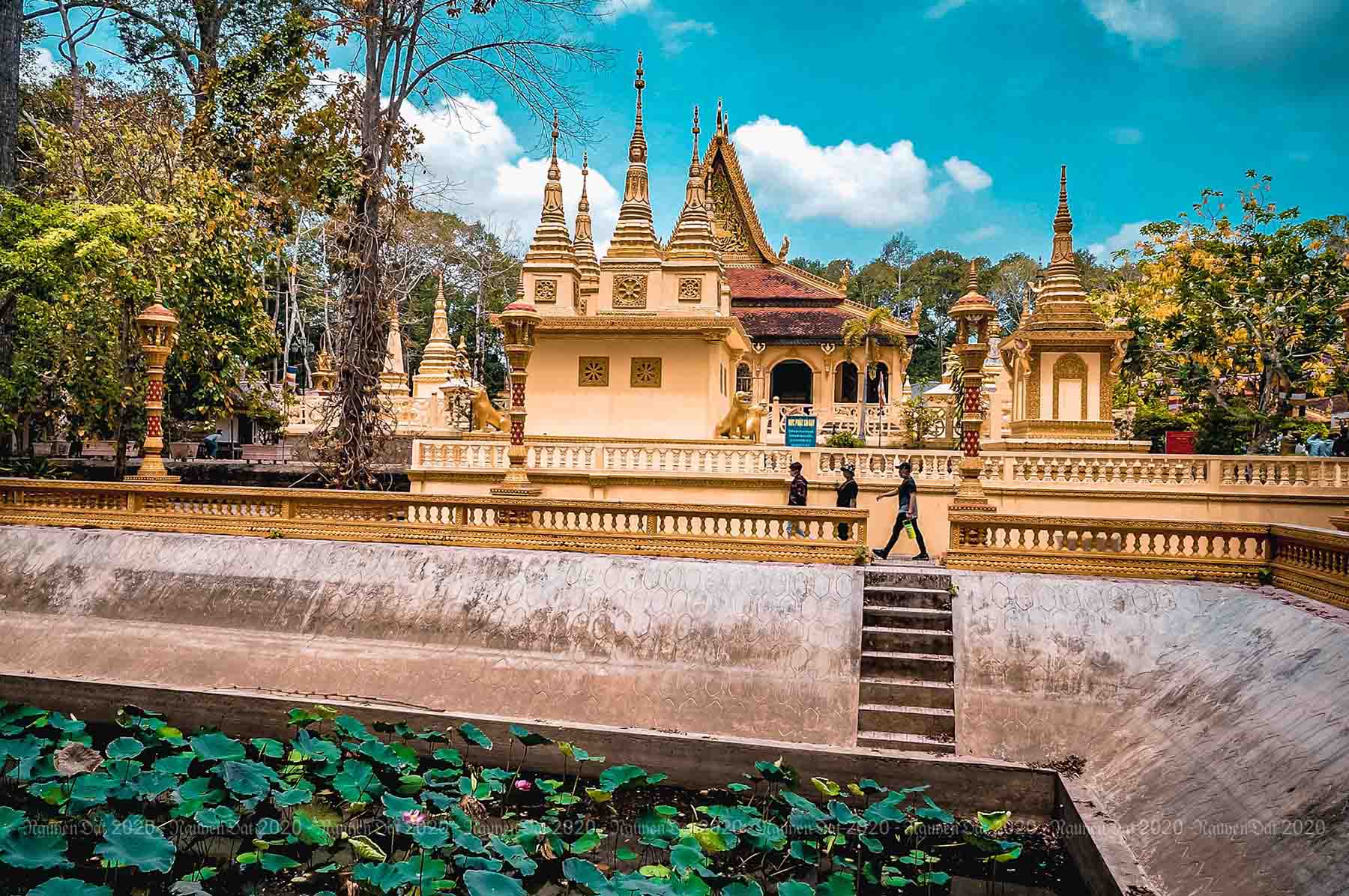 Điểm nhấn của chùa Âng là hệ thống cột gỗ được chạm khắc tinh xảo hình rồng, tiên nữ và chim thần. Mái chùa được thiết kế độc đáo với ba cấp mái, tạo cảm giác uy nghiêm và linh thiêng. Ảnh: Nguyễn Quốc Đạt