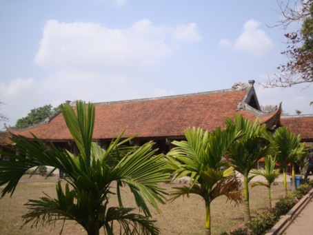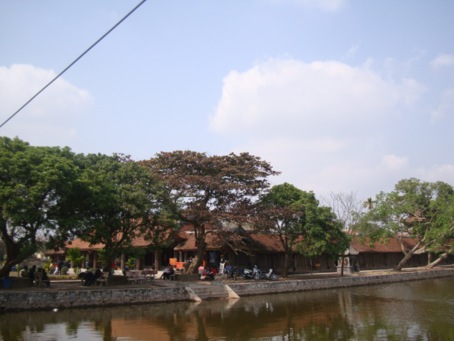 Mặt trước chùa Keo nhìn ra một hồ nước