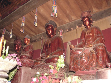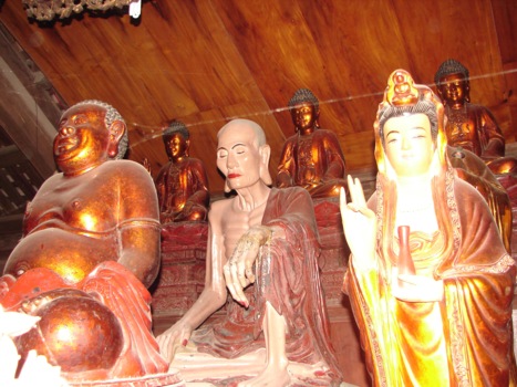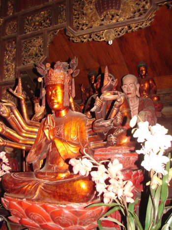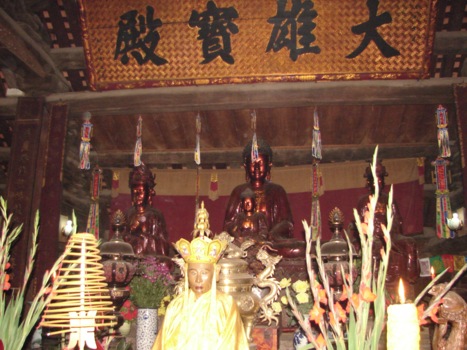 Tượng Thiền sư Từ Đạo Hạnh, phía trên là ba pho Di Đà