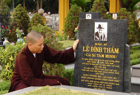 Bây giờ thật tình cờ tôi được về ngồi bên mộ cụ, mãi mê nhìn hình cụ và đọc những dòng chữ trên bia mộ ” Bác sĩ Lê Đình Thám (Cư sĩ Tâm Minh, Uỷ viên đoàn Chủ tịch Uỷ Ban Trung Ương Mặt Trận Tổ Quốc Việt Nam, Chủ tịch Uỷ Ban Bảo Vệ Hoà Bình Thế Giới của Việt Nam, Uỷ viên Hội đồng Hoà bình Thế Giới, Phó Chủ tịch Hội Phật giáo Thống nhất Việt Nam, Huân chương độc lập hạng ba, huân chương kháng chiến hạng nhất. Quê quán, Điện Quang, Điện Bàng, Quảng Nam. Sinh ngày 1.5.1897, mất ngày 23.4.1969“, Lòng tôi vô cùng xúc động”.