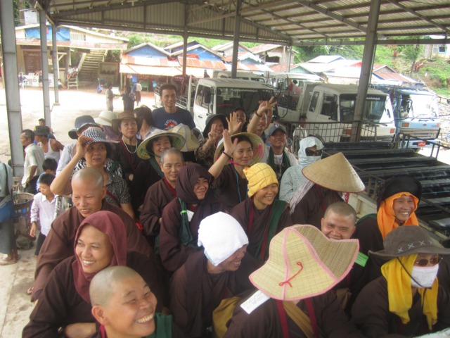 Chúng tôi ấn tượng nhất là công đoạn chuyển xe để lên núi. Tất cả 32 thầy trò chúng tôi được đưa lên ngồi trên chiếc xe chuyên dụng của hãng Nissan, trông đúng như một chiếc xe tải chở hàng. Xe rất khỏe, 2 cầu để leo núi. Tất cả được ngồi vào thùng xe phía sau. Trên ca bin lái xe có thêm 2 chỗ ngồi. Thế là tôi được Đại đức Thích Minh Đồng mời lên ngồi cùng như 1 thị giả. Thật vinh dự. Bên cạnh là bác tài người địa phương.