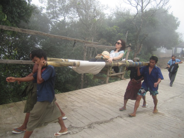 Cũng phải nói thêm, từ đoạn giữa núi này, xuất hiện những người địa phương làm dịch vụ cõng hàng thuê và khênh người. Nếu có hàng hóa, họ đựng vào gùi sau lưng và cõng lên. Nếu ai yếu không leo được đã có 4 người đàn ông cho bạn ngồi lên ghế. Họ dùng 2 đòn tre và khênh bạn trên vai. Tôi đã chứng kiến và chụp được những bức ảnh các bạn Hàn Quốc được họ “phục vụ”. Cái ngạc nhiên là những người bạn của xứ sở Kim Chi này còn rất trẻ. Thầy Thích Minh Đồng bảo tôi rằng dân Hàn Quốc quen ngồi văn phòng nên ngại trèo núi và họ không leo núi với quãng thời gian hơn 60 phút đâu. Thật là có lý.