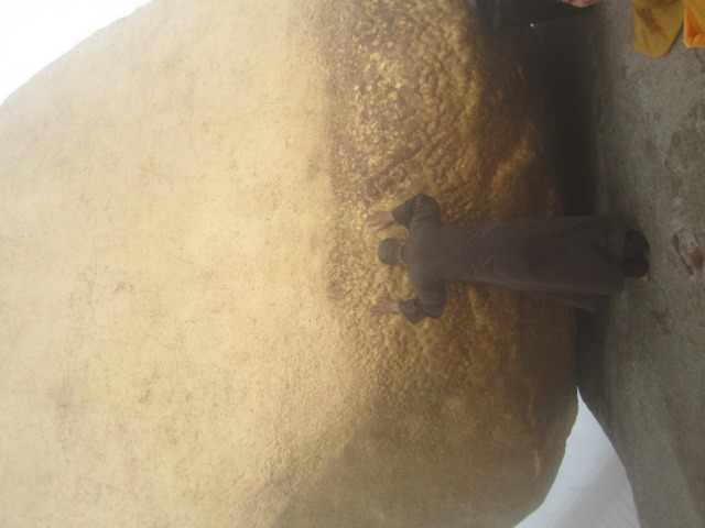 Lại nói về tảng đá kỳ diệu này, tôi đã ngồi ngắm kỹ kết cấu từ các góc cạnh khác nhau để tìm ra nguyên nhân trụ vững nơi đây. Bản chất về mặt khoa học là trọng lực phải được dồn vào tâm điểm và phần nặng phải nằm trong tảng đá phía dưới. Trong khi đó cả 2 tảng đá chồng lên nhau và nằm trên đỉnh của núi Kyaiktiyo rất chênh vênh. Vẫn khó hiểu. Nếu phân tích theo khoa học với góc độ của dân khoa học như tôi thì… bó tay!