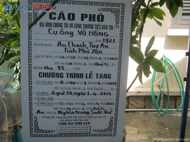 Lễ di quan tiển biết Thầy về nơi an nghĩ sẽ tổ chức vào lúc 15 giờ ngày 04-04-2013, an táng tại Nghĩa Trang Suối Đá, huyện Cam Lâm (Khánh Hòa)