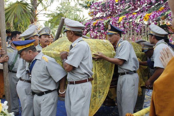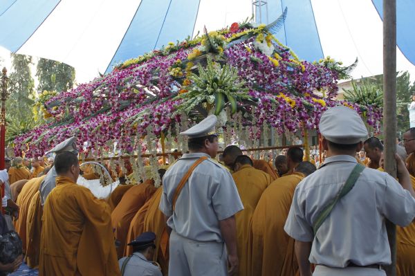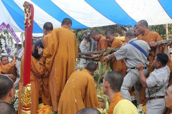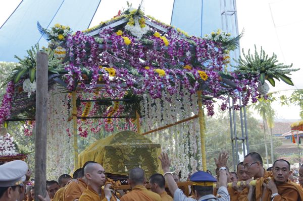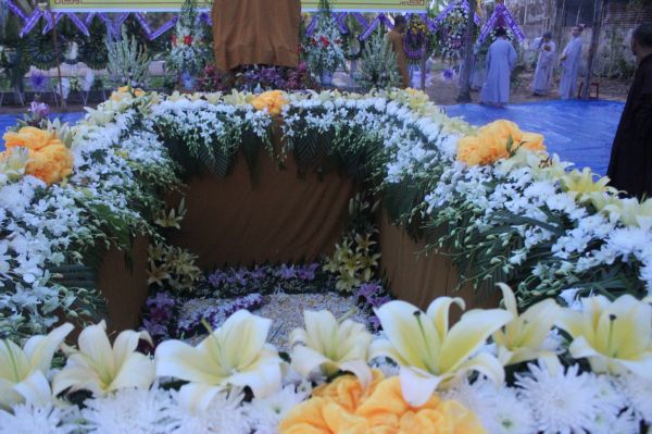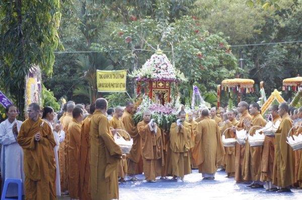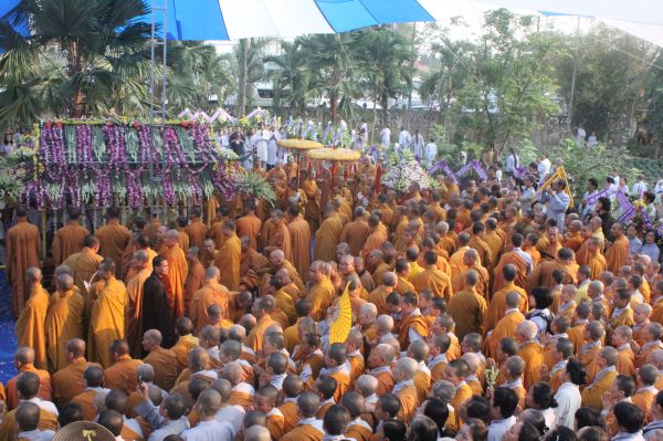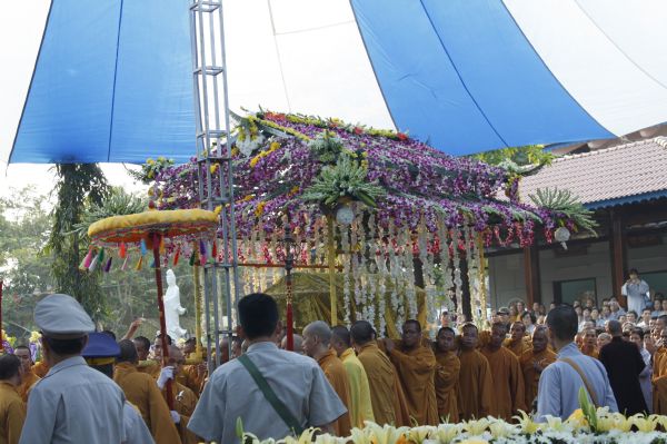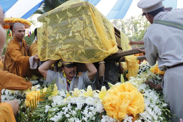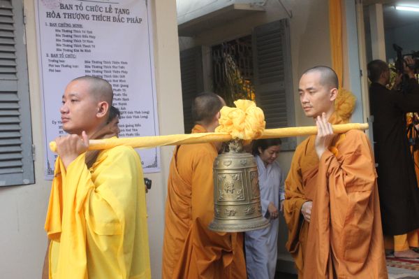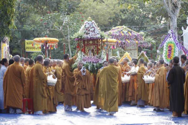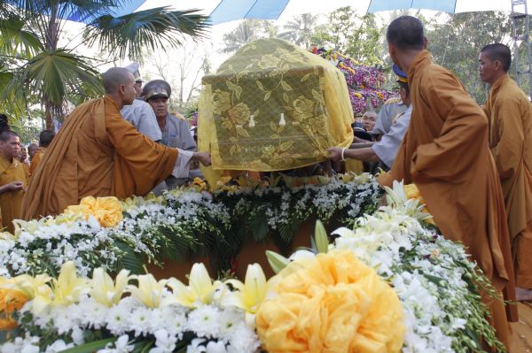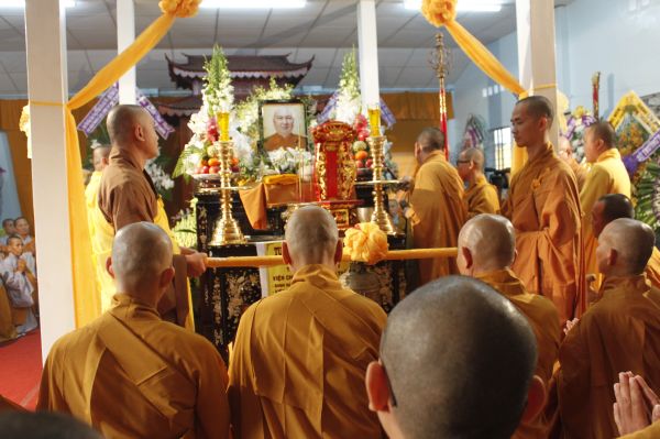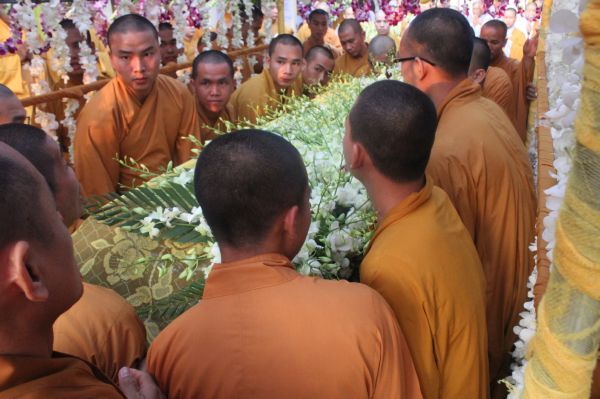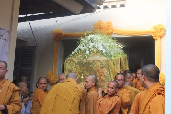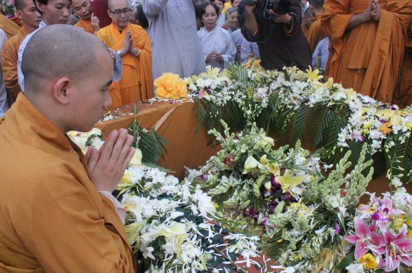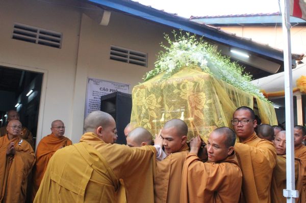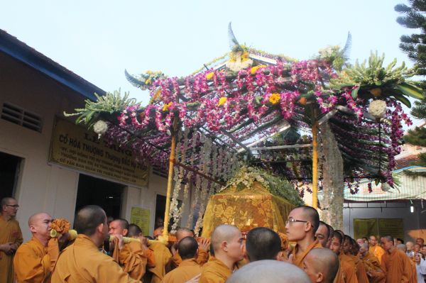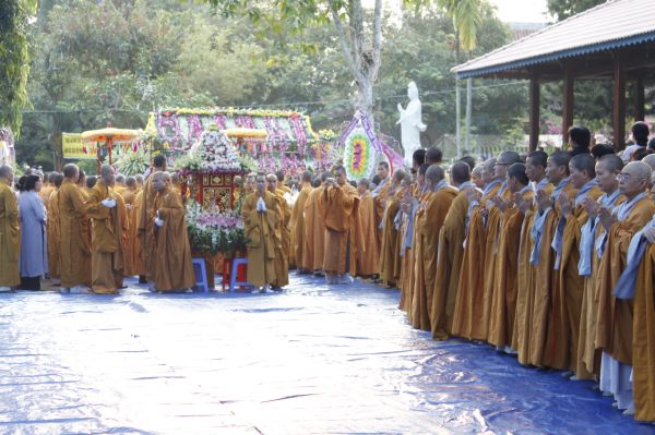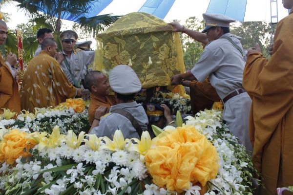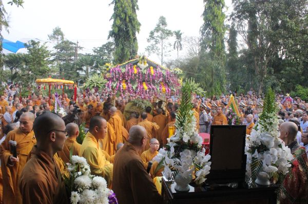 – Ban kinh sư tác lễ triệt linh sàng, chính thức di quan. Đại lễ cung tống kim quan được tổ chức trang nghiêm trong thể, dưới sự chứng minh, gia trì của chư tôn đức lãnh đạo giáo hội, dưới sự hộ niệm thiết tha của chư tôn đức Tăng Ni cùng quý Phật tử. Tiếng niệm Phật vang dài lung linh cả một góc trời Sơn Thắng, tạo nên khúc nhạc trầm hùng, ru lời ru tiễn biệt ngàn thu.