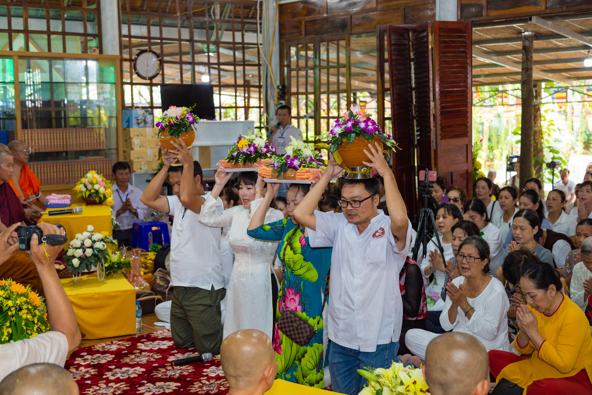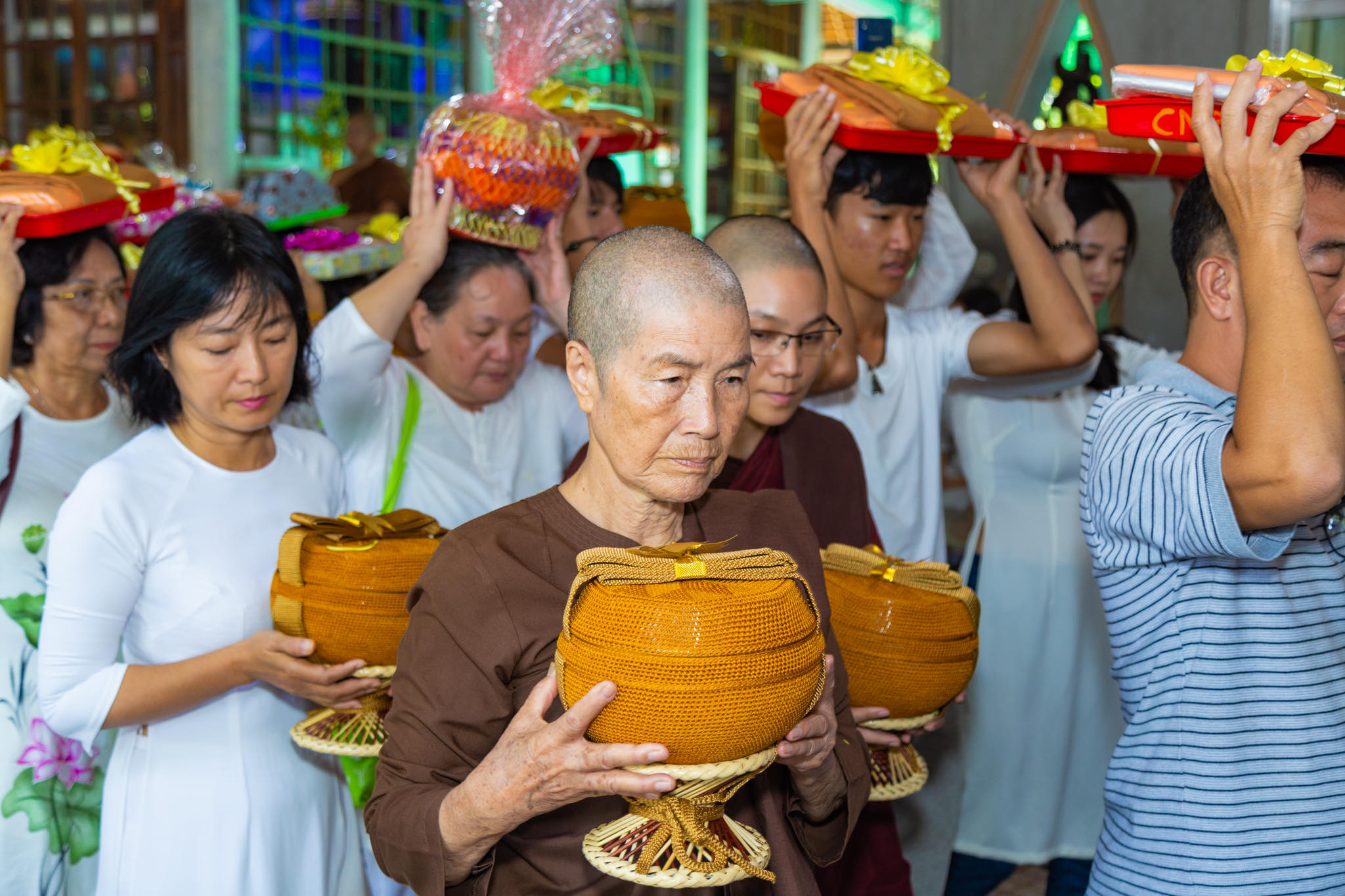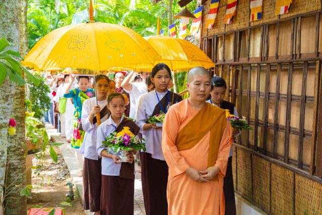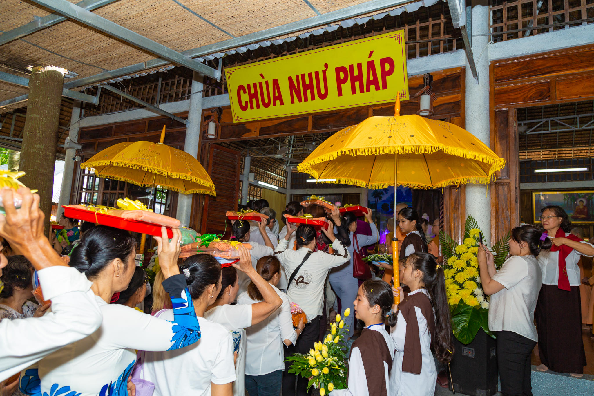 Kết thúc thời pháp thoại, đúng vào lúc 9h, toàn thể Phật tử dưới sự hướng dẫn của sư cô Mỹ Nhung, trưởng ban quản trị chùa Như Pháp đã đội y ca sa, Pháp bảo và lễ phẩm nhiễu 3 vòng quanh khuôn viên chùa Như Pháp trong tiếng tụng niệm bài kệ dâng y Tu Nữ đúng theo lịch sử truyền thống Nam tông trầm hùng.