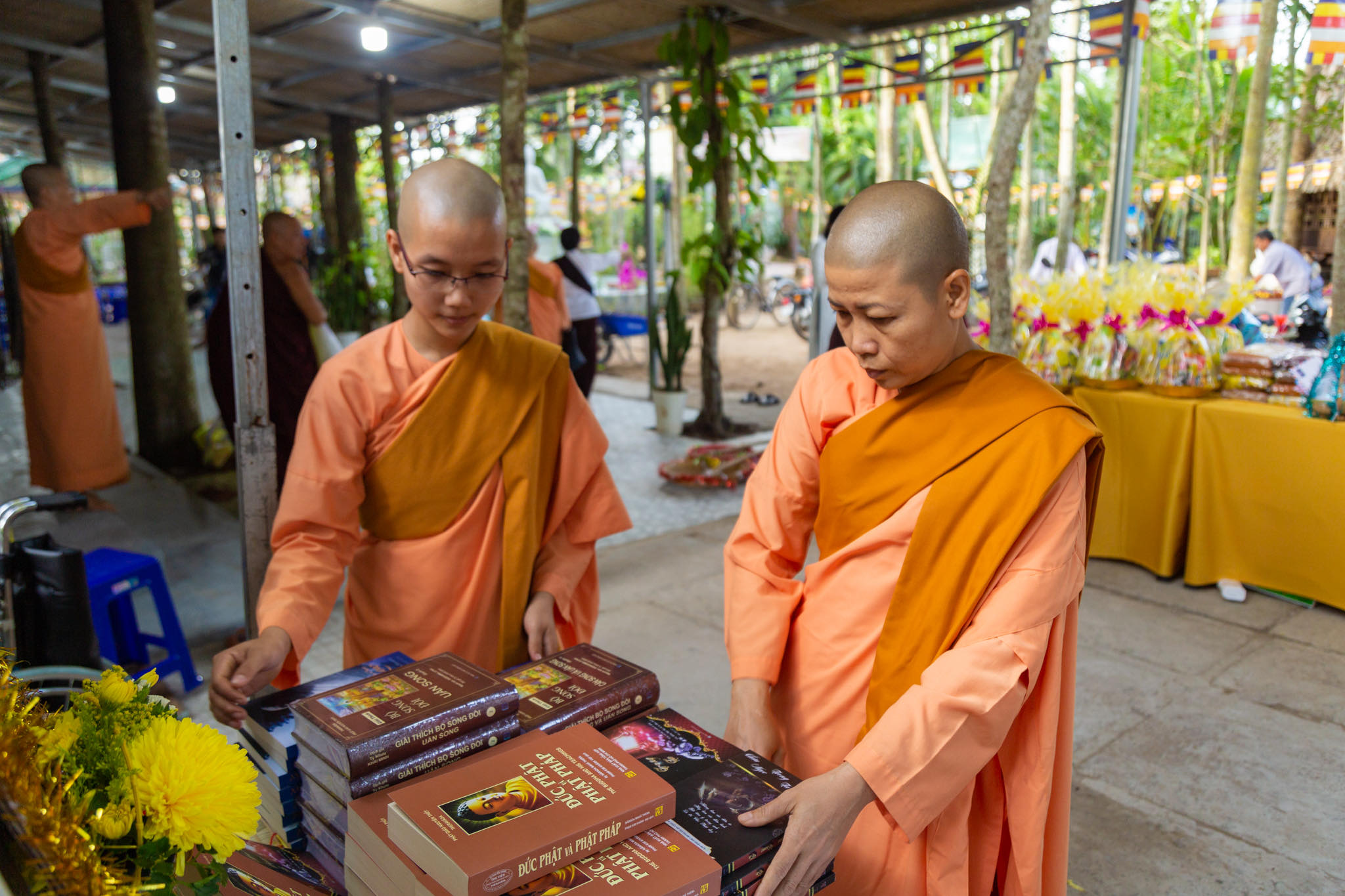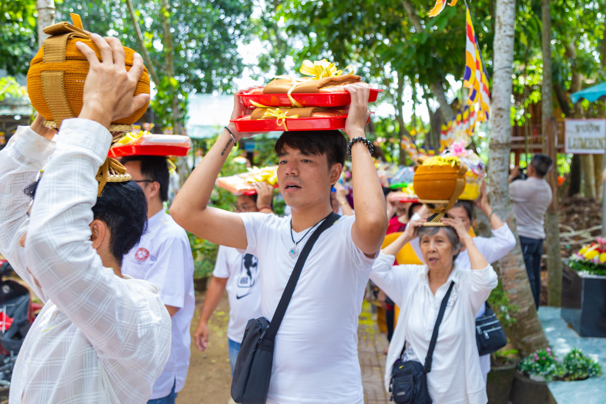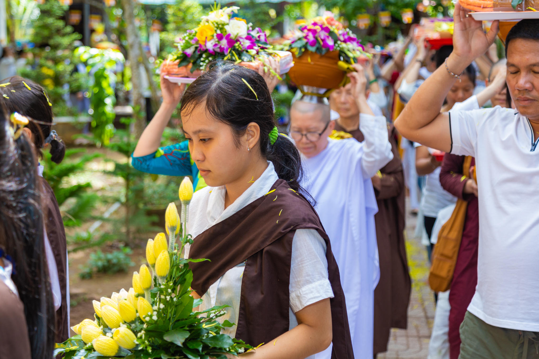 Kết thúc thời pháp thoại, đúng vào lúc 9h, toàn thể Phật tử dưới sự hướng dẫn của sư cô Mỹ Nhung, trưởng ban quản trị chùa Như Pháp đã đội y ca sa, Pháp bảo và lễ phẩm nhiễu 3 vòng quanh khuôn viên chùa Như Pháp trong tiếng tụng niệm bài kệ dâng y Tu Nữ đúng theo lịch sử truyền thống Nam tông trầm hùng.