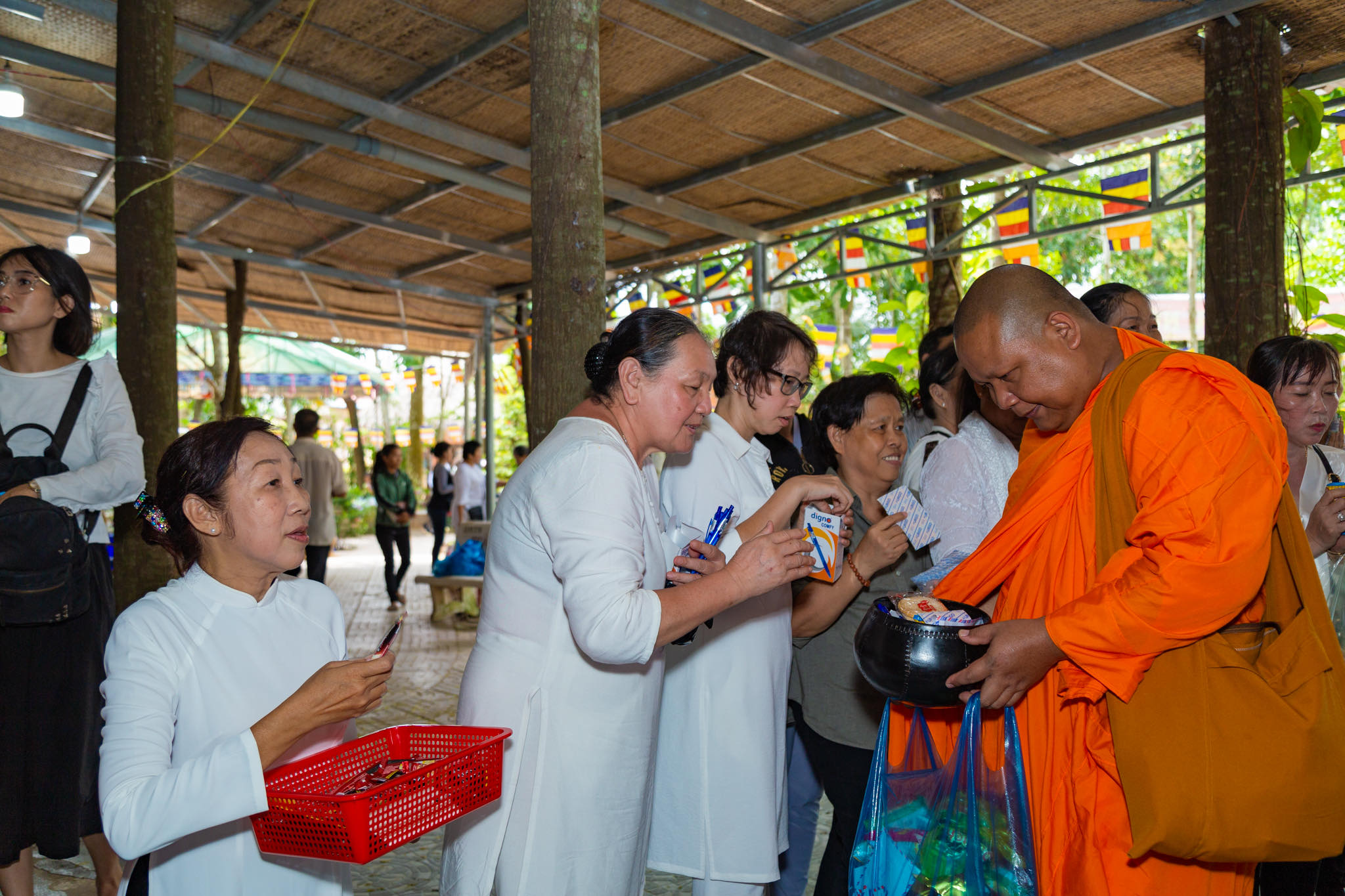 Lễ đặt bát hội diễn ra sau đó cúng dường tứ vật dụng đến 50 vị tăng ni trước khi độ ngọ. Để buổi lễ thêm phần công đức, vào lúc 13h cùng ngày, nhóm Phật tử “Niềm An Vui” tại thành phố Hồ Chí Minh đã phát tâm trao tặng 60 phần quà đến những người cao tuổi neo đơn và hộ gia đình có hoàn cảnh khó khăn xung quanh chùa.
