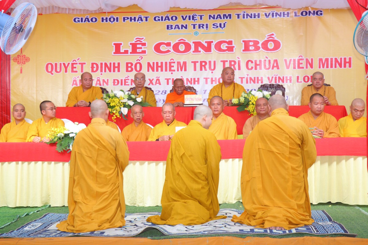 Tại buổi lễ, TT. Thích Tâm Khiết – Phó Ban kiêm Chánh Thư ký BTS GHPGVN tỉnh tuyên đọc Quyết định số 264/QĐ-BTS, ngày 26 tháng 12 năm 2025 của Ban Trị sự GHPGVN tỉnh Vĩnh Long bổ nhiệm ĐĐ.Thích Long Hoa đảm nhiệm trụ trì chùa Viên Minh, xã Thành Thới, tỉnh Bến Tre.