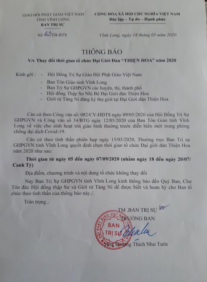 Căn cứ tinh thần phiên họp vào ngày 15/05/2020, Thường trực BTS GHPGVN tỉnh Vĩnh Long quyết định chọn thời gian tổ chức Đại Giới Đàn “Thiện Hoa” năm 2020 như sau: