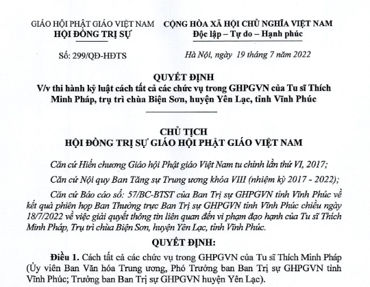 Hội đồng Trị sự Giáo hội Phật giáo Việt Nam (GHPGVN) ra quyết định thi hành kỷ luật, cách toàn bộ chức vụ của tu sĩ Thích Minh Pháp- trụ trì chùa Biện Sơn, huyện Yên Lạc (Vĩnh Phúc).