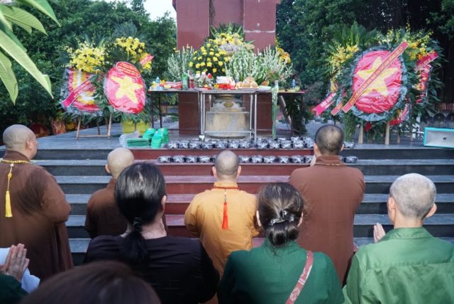 Trong không khí trang nghiêm và đầy xúc động chư Tôn đức Tăng, quý Phật tử đã trang nghiêm thực hiện nghi thức tụng kinh cầu siêu, dâng hương, dâng hoa để tưởng nhớ và tri ân sâu sắc các thế hệ cha anh đã không tiếc máu xương, tuổi xuân dâng trọn đời mình cho độc lập tự do của dân tộc, cho hạnh phúc của nhân dân.