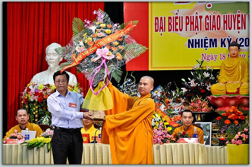 Tại Đại hội bà Nguyễn thị Nhung – huyện ủy viên Phó chủ tịch UBND huyện Vĩnh Tường đã thay mặt các cấp lãnh đạo phát biểu chào mừng, bày tỏ sự tin tưởng Ban Đại diện Phật giáo huyện Vĩnh Tường trong tương lai sẽ phát huy năng động đoàn kết, xây dựng, phát triển vững mạnh, làm tốt Đạo lợi đời trong tinh thần Hộ Quốc An Dân.