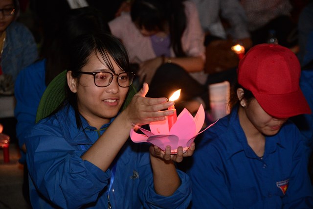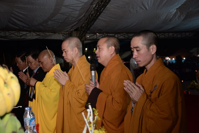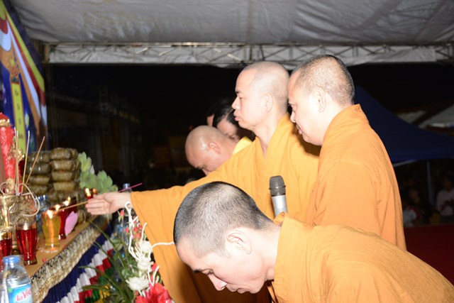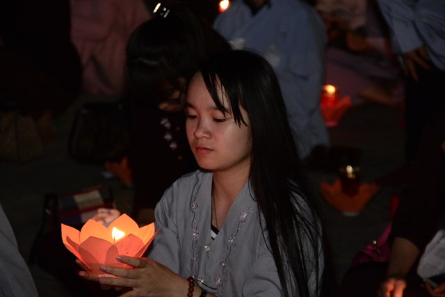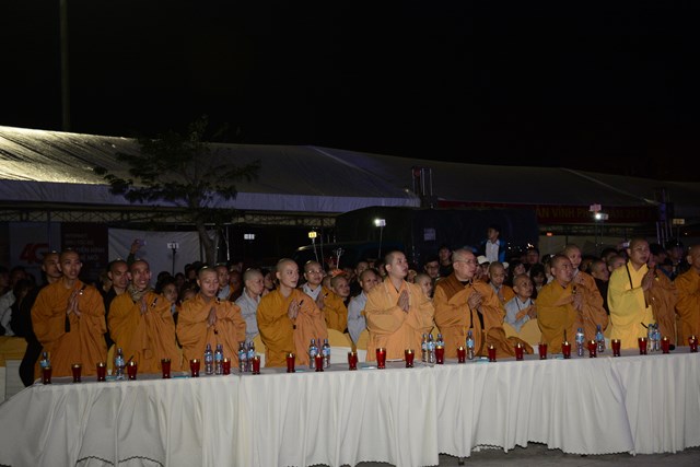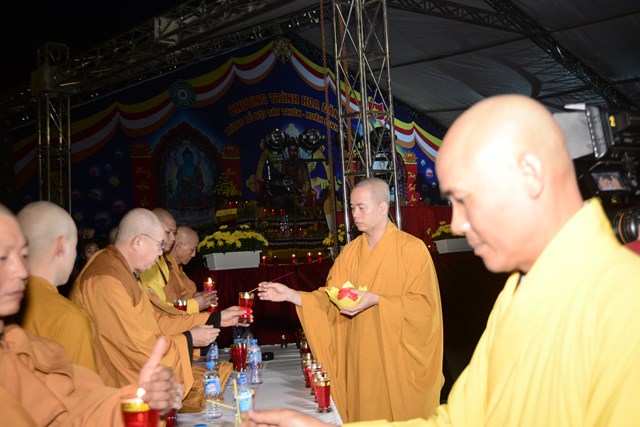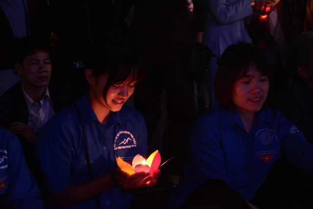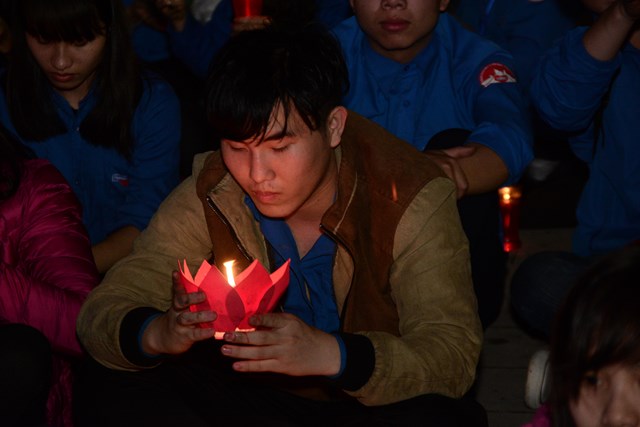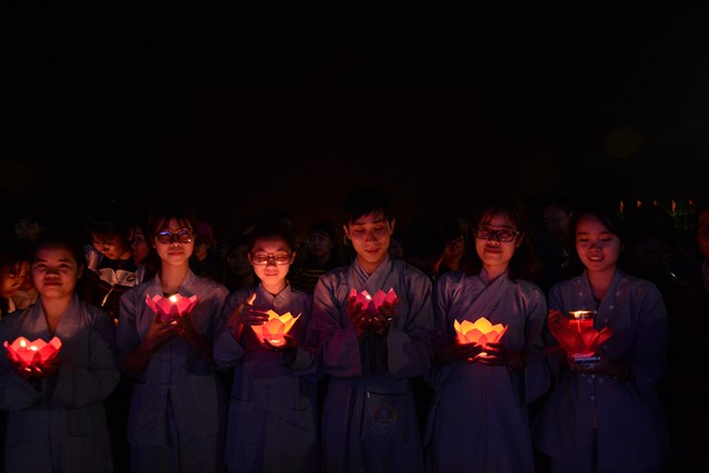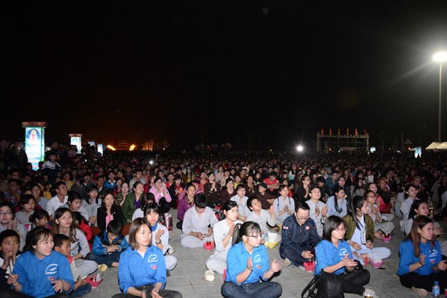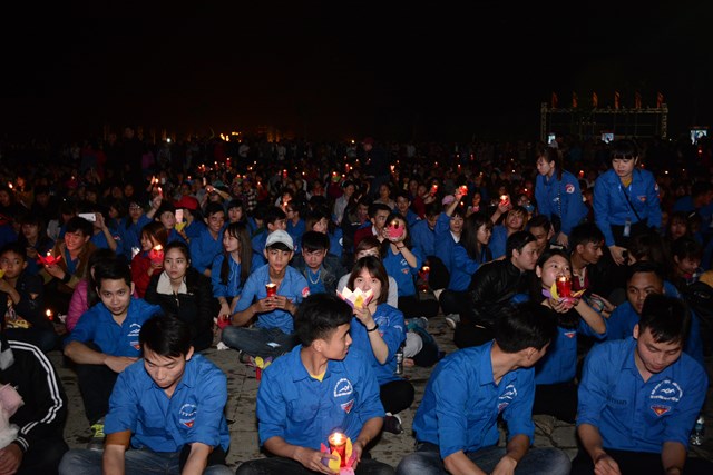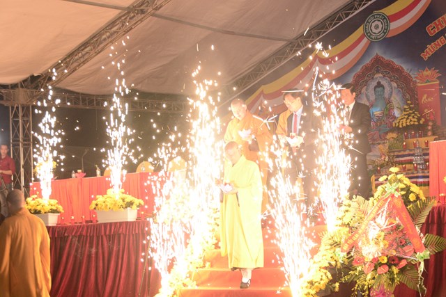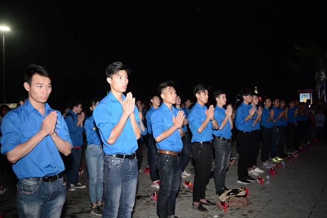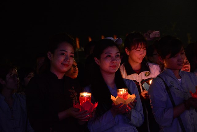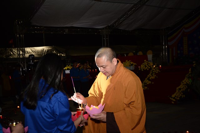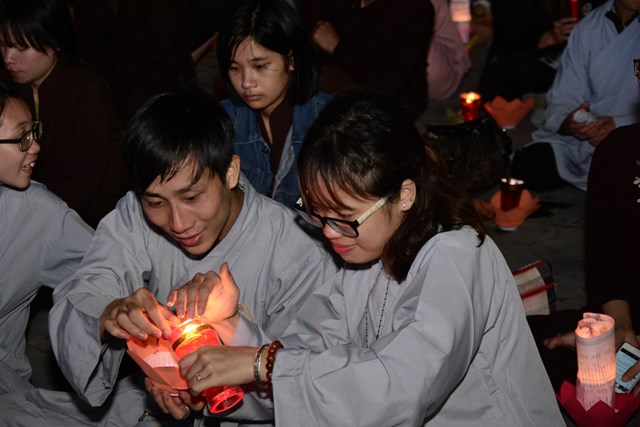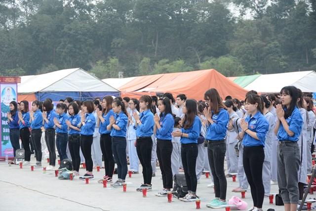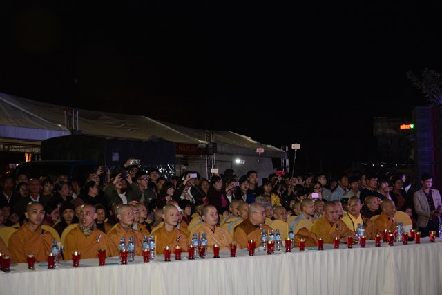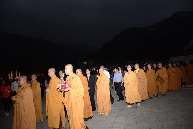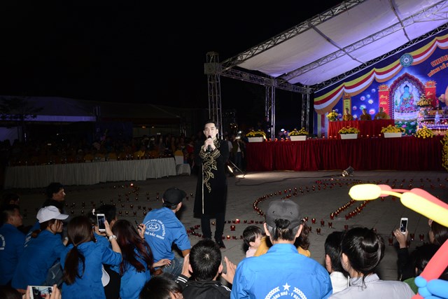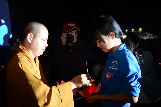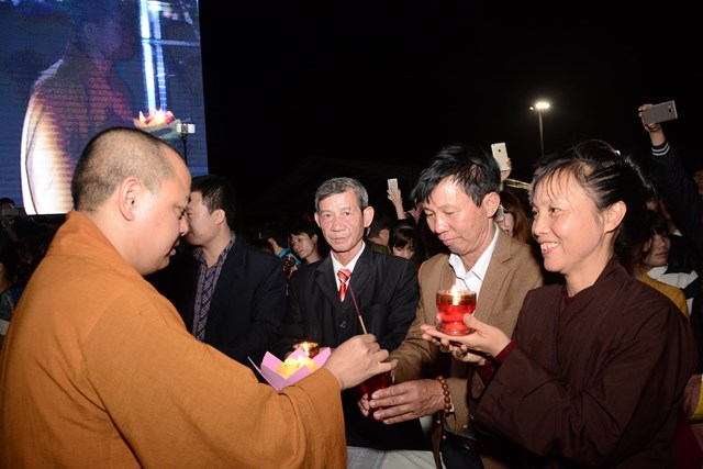 Thời khắc linh thiêng nhất của buổi lễ đã đến khi Chư tôn đức chứng minh và các cấp chính quyền tổ chức lễ dâng hương bạch Phật. Sau đó, từng ngọn đèn hoa đăng đã được thắp sáng tạo nên một không gian linh thiêng, một sân nến lung linh, huyền ảo giữa đất trời Tây Thiên mà ông cha ta vẫn thường gọi là “Đất Rồng Thiêng” – Một bảo vật vô giá do thiên nhiên ban tặng Đất nước Việt Nam của chúng ta. “Nến truyền nến, tâm truyền tâm” – những ngọn nến biểu tượng cho từ bi, cho trí tuệ đã phá tan màn vô minh si ám. Ngọn nến của tình thương và hiểu biết chiếu soi vào ngõ ngách của cuộc đời, thắp sáng niềm tin và hy vọng. Và từ ngọn nến đầu tiên được Đại đức phó Ban trị sự GHPGVN tỉnh Vĩnh Phúc được truyền sang cho chư tôn đức Tăng Ni và các cấp chính quyền, từ đó ánh sáng tiếp tục được truyền tới cho hàng ngàn sinh viên có mặt tại buổi lễ. ánh sáng lung linh của ngàn ngọn nến, hòa quyện với khói hương nghi ngút, tạo nên một vùng trời bình yên, thanh tịnh và an lành nơi cõi nhân gian. Khi ánh sáng lan tỏa khắp sân lễ hội, trong sự thành kính, hàng ngàn người con Phật, hàng ngàn bạn trẻ đã đối trước tôn tượng uy nghiêm thanh thoát, lắng nghe lời đạo từ của Đại đức Thích Thanh Lâm – Phó ban trị sự GHPGVN tỉnh Vĩnh Phúc.