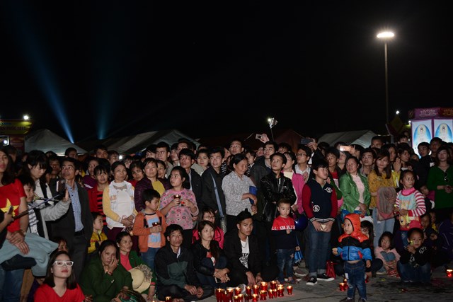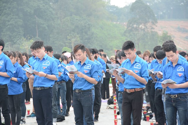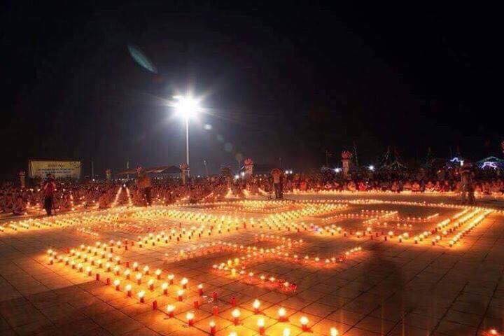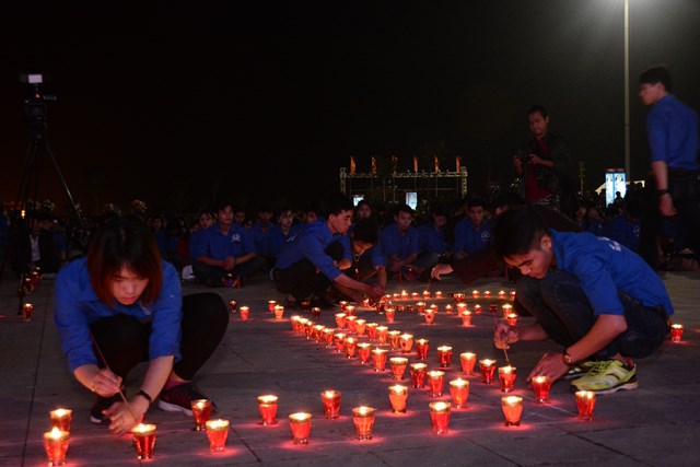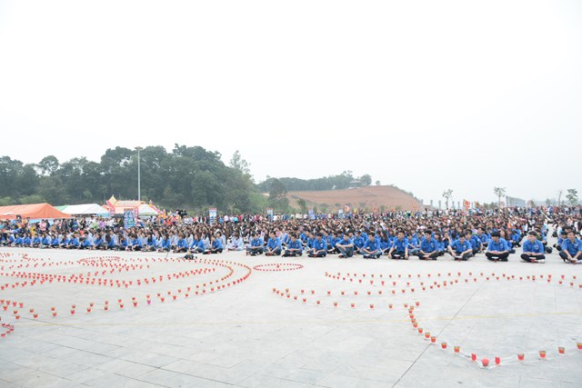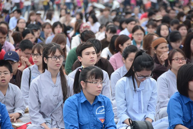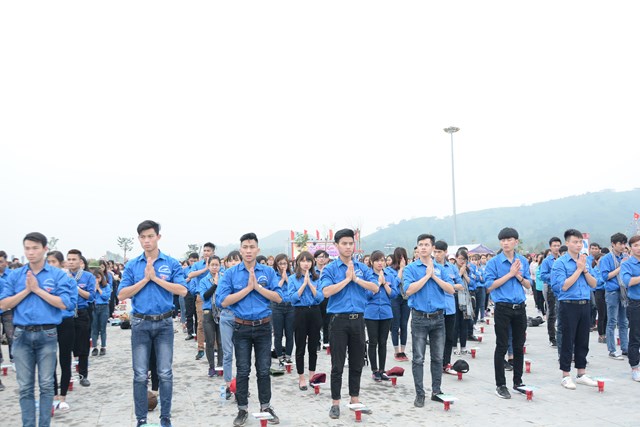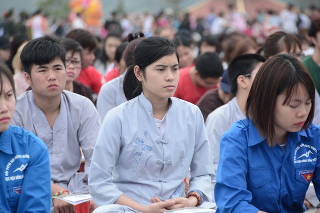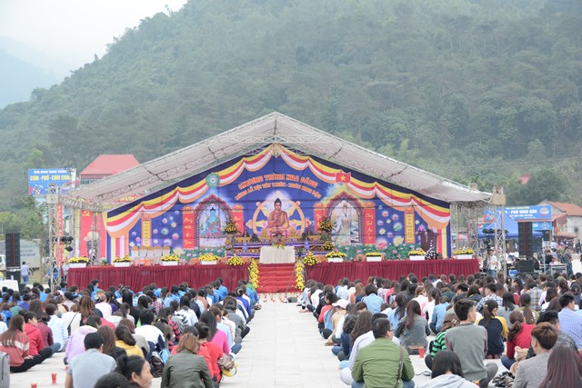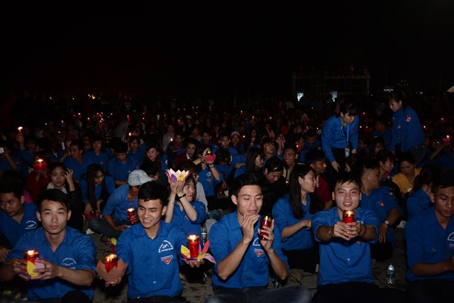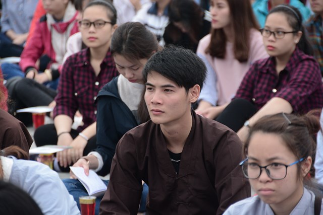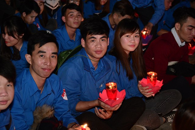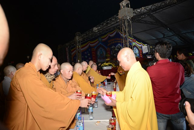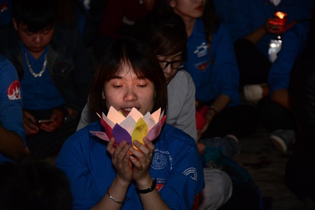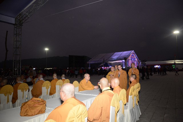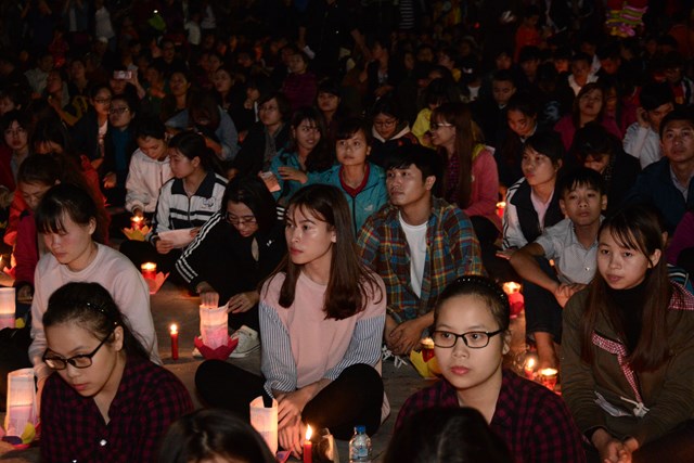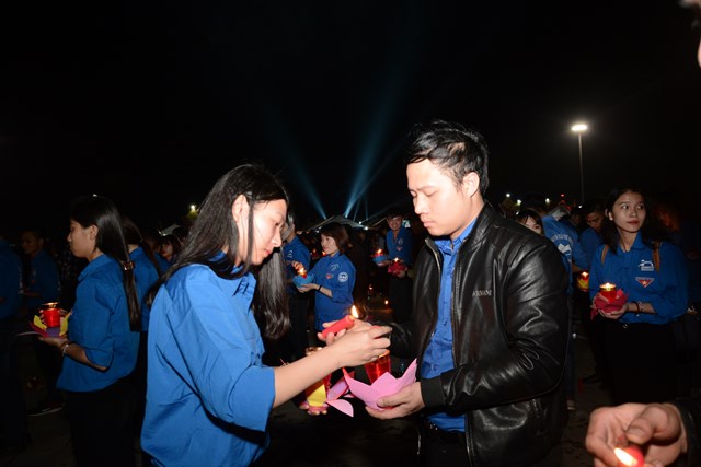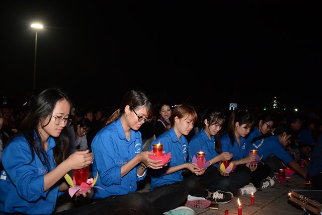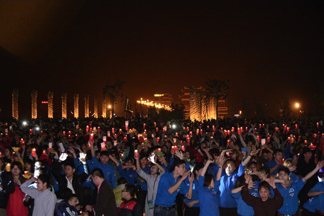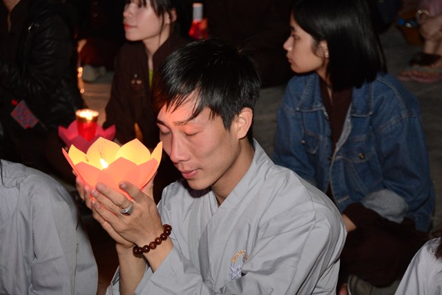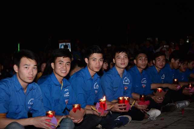 Thời khắc linh thiêng nhất của buổi lễ đã đến khi Chư tôn đức chứng minh và các cấp chính quyền tổ chức lễ dâng hương bạch Phật. Sau đó, từng ngọn đèn hoa đăng đã được thắp sáng tạo nên một không gian linh thiêng, một sân nến lung linh, huyền ảo giữa đất trời Tây Thiên mà ông cha ta vẫn thường gọi là “Đất Rồng Thiêng” – Một bảo vật vô giá do thiên nhiên ban tặng Đất nước Việt Nam của chúng ta. “Nến truyền nến, tâm truyền tâm” – những ngọn nến biểu tượng cho từ bi, cho trí tuệ đã phá tan màn vô minh si ám. Ngọn nến của tình thương và hiểu biết chiếu soi vào ngõ ngách của cuộc đời, thắp sáng niềm tin và hy vọng. Và từ ngọn nến đầu tiên được Đại đức phó Ban trị sự GHPGVN tỉnh Vĩnh Phúc được truyền sang cho chư tôn đức Tăng Ni và các cấp chính quyền, từ đó ánh sáng tiếp tục được truyền tới cho hàng ngàn sinh viên có mặt tại buổi lễ. ánh sáng lung linh của ngàn ngọn nến, hòa quyện với khói hương nghi ngút, tạo nên một vùng trời bình yên, thanh tịnh và an lành nơi cõi nhân gian. Khi ánh sáng lan tỏa khắp sân lễ hội, trong sự thành kính, hàng ngàn người con Phật, hàng ngàn bạn trẻ đã đối trước tôn tượng uy nghiêm thanh thoát, lắng nghe lời đạo từ của Đại đức Thích Thanh Lâm – Phó ban trị sự GHPGVN tỉnh Vĩnh Phúc.