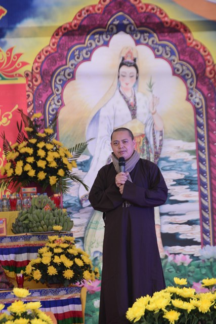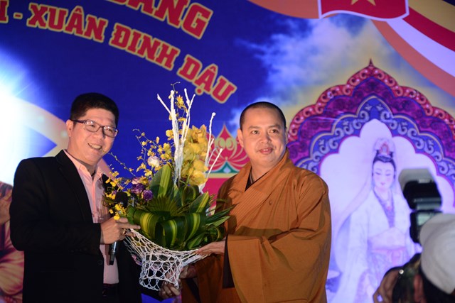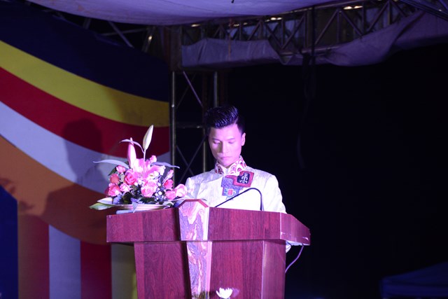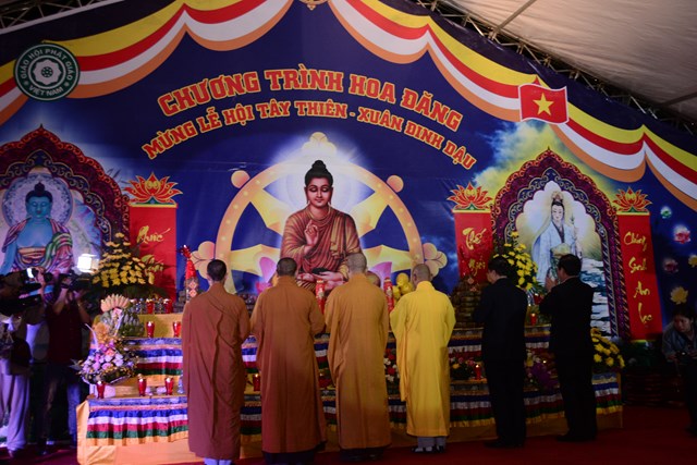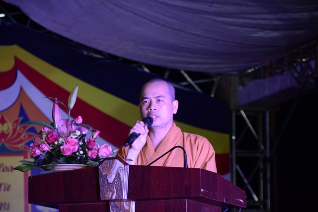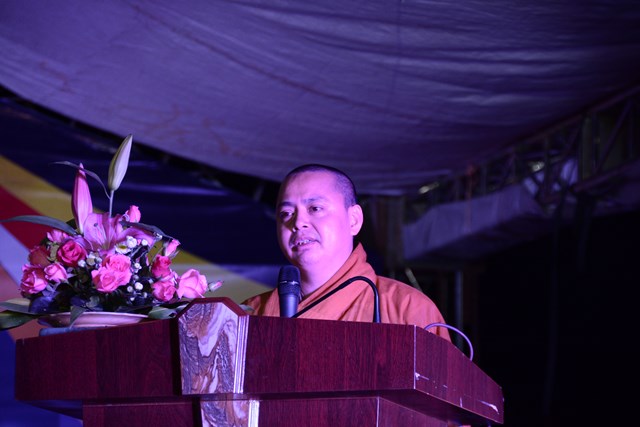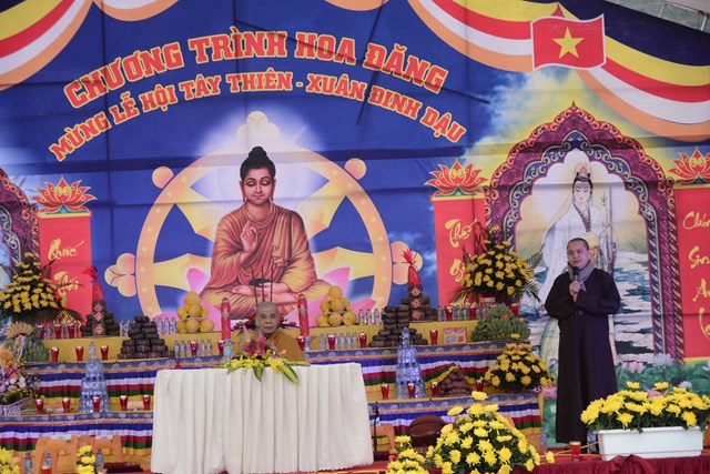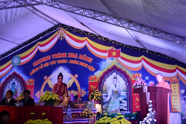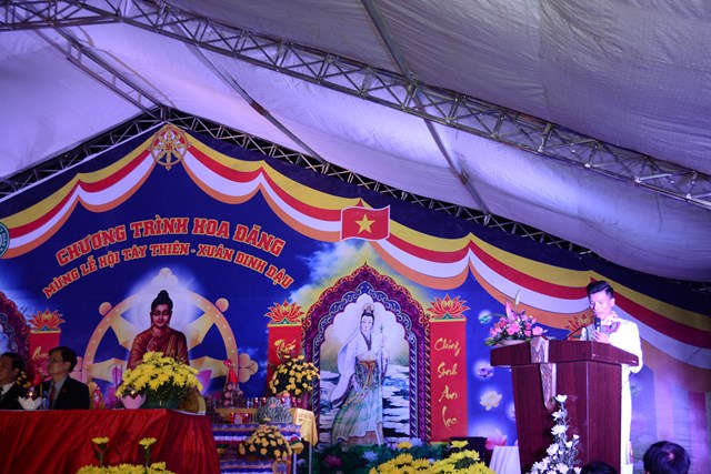 Thay mặt cho BTC đại lễ, đại đức Thích Thanh Phương – Trưởng BTS GHPGVN huyện Tam Đảo, trưởng BTC Đêm hội hoa đăng Tây Thiên 2017 đã lên phát biểu khai mạc. Nhân lễ hội truyền thống Tây Thiên xuân Đinh Dậu 2017, BTS GHPGVN huyện Tam Đảo đã tổ chức chương trình Đêm hội hoa đăng khai Pháp bảo đại thừa cầu nguyện Quốc thái dân an, chúng sinh an lạc, đồng thời kỷ niệm ngày Đức Phật Thích Ca Mâu Ni xuất gia 8/2/ÂL và ngày Đức Phật Thích Ca Mâu Ni nhập niết bàn 15/2ÂL, cùng nhau dâng trọn tấm lòng thành kính tưởng niệm, tri ân Đức Phật – Một bậc chính đẳng chính giác, một bậc giác tha, giác hạnh viên mãn ra đời để cứu độ chúng sinh. Ngài đã để lại cho chúng ta một kho tàng giáo pháp vô giá, giúp chúng sinh thoát khỏi khổ đau, thoát khỏi sinh tử luân hồi. Việc tổ chức đêm hội hoa đăng cũng là nhằm để tri ân công đức vô lượng của Ngài, thông qua đó cầu nguyện cho thế giới hòa bình, chúng sinh an lạc. Đây cũng chính là sự kiện văn hóa tâm linh mở đầu cho các chuỗi sự kiện văn hóa tâm linh sắp được diễn ra tại Tây Thiên trong mùa lễ hội xuân Đinh Dậu năm nay.