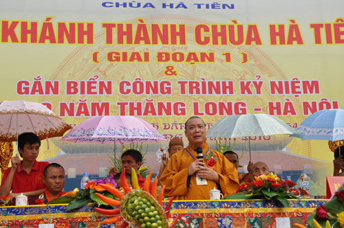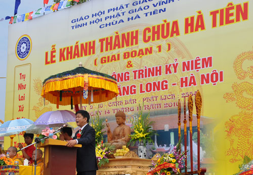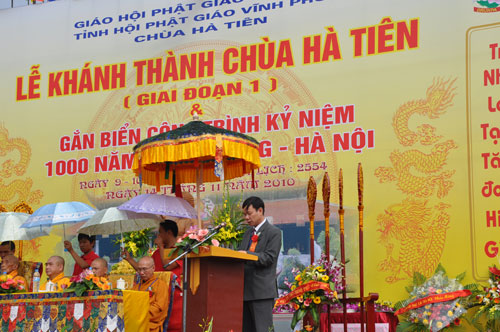 Ông Hoàng Duy Hân – Phó bí thư Đảng uỷ, Chủ tịch UBND xã Định Trung – phó trưởng Ban quản lý xây dựng chùa Hà Tiên đọc báo cáo quá trình tu bổ tôn tạo chùa.