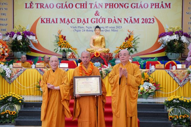 Tại buổi lễ, thay mặt Trung ương Giáo hội, TT. Thích Thanh Tuấn – Phó Tổng Thư ký kiêm Chánh VP 1 TW đã thông qua quyết định và điều phối nghi thức trao Giáo chỉ tấn phong Giáo phẩm. Theo đó, toàn tỉnh có 18 chư Tăng Ni được tấn phong giáo phẩm Thượng toạ, Ni sư (Thượng tọa 05 vị; Ni Sư 13 vị) là chư tôn đức có nhiều đóng góp cho công tác Phật sự, hướng dẫn tín đồ Phật tử tu học; sống tốt đời, đẹp đạo, xây dựng chùa tinh tiến.