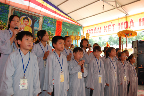 Sau nghi lễ niệm hồng danh Đức Bản sư là chương trình văn nghệ chào mừng của các thành viên CLB Thanh thiếu nhi Phật tử chùa Tích Sơn.