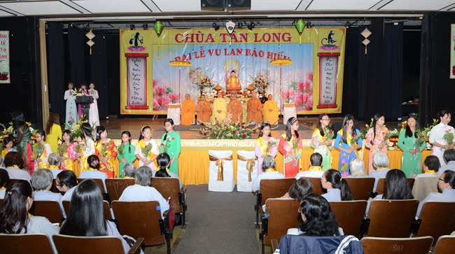 Phần văn nghệ ở chùa Tân Long khá đặc sắc với 17 tiết mục chủ đề: “Tình ca dâng cha mẹ” như: Bông hồng cài áo, Tâm sự người cài hoa trắng, Mẹ tôi, Thiên thu tình mẹ, Nhớ mẹ lý mồ côi, Đổi cả thiên thu tiếng mẹ cười, Tình cha, Ơn nghĩa sinh thành, Công cha nghĩa mẹ, Tình mẹ, … qua các giọng ca: Đông Phương, Thu Hiền, Victoria, Mai Lệ Quyên, Lena, Hoàng Tâm …; cùng các tiết mục múa của thiếu nhi chùa Tân Long.