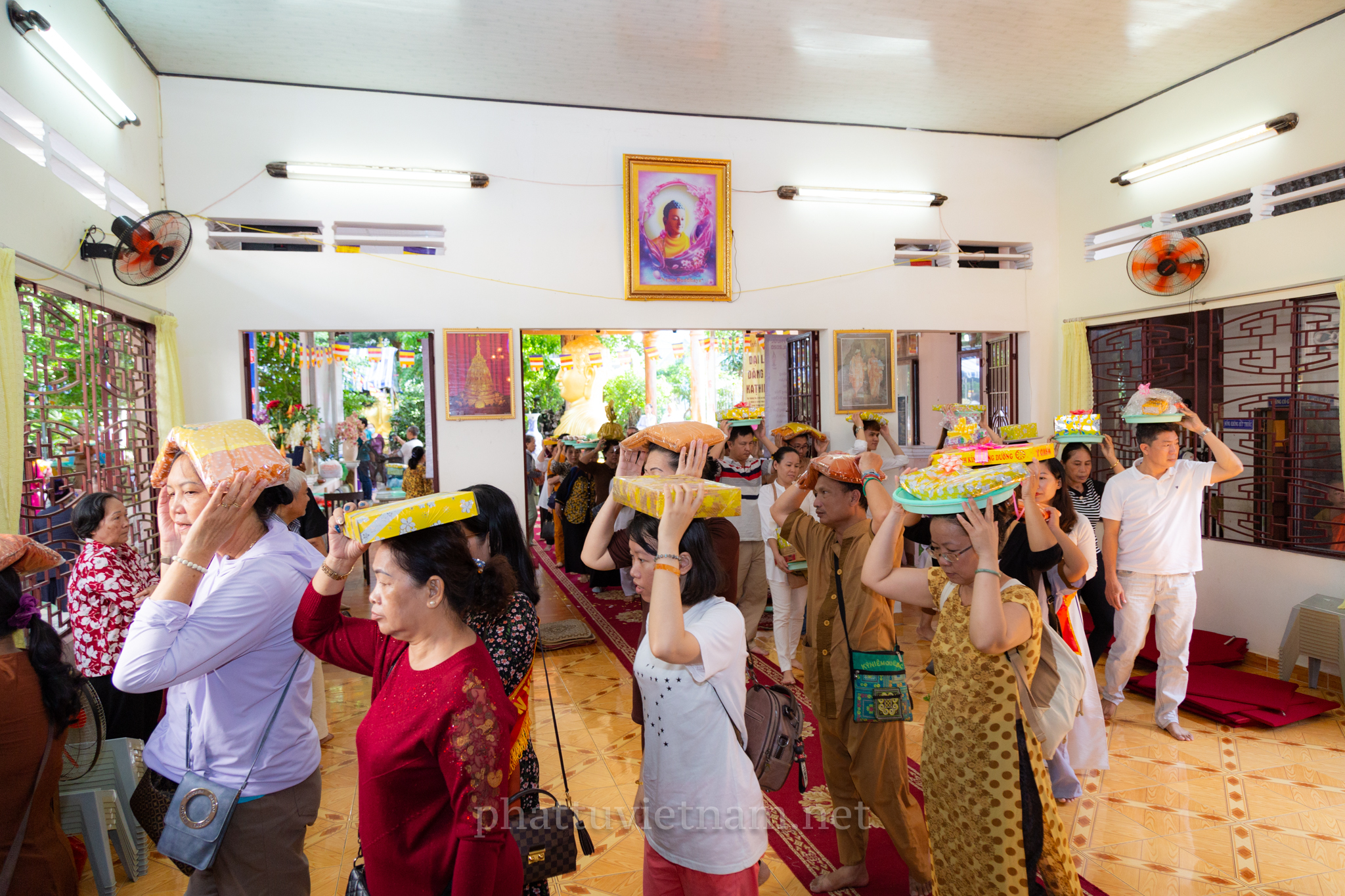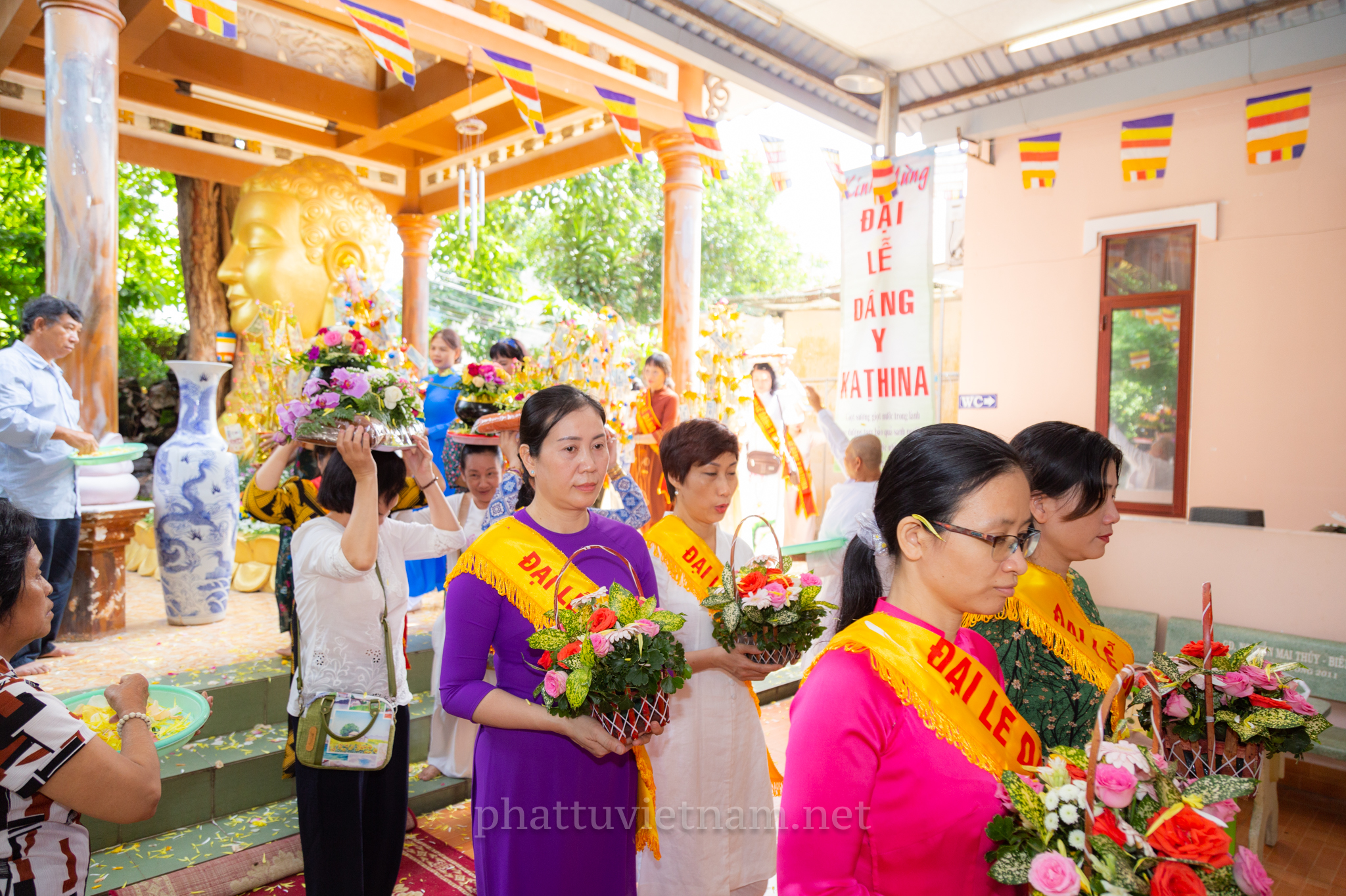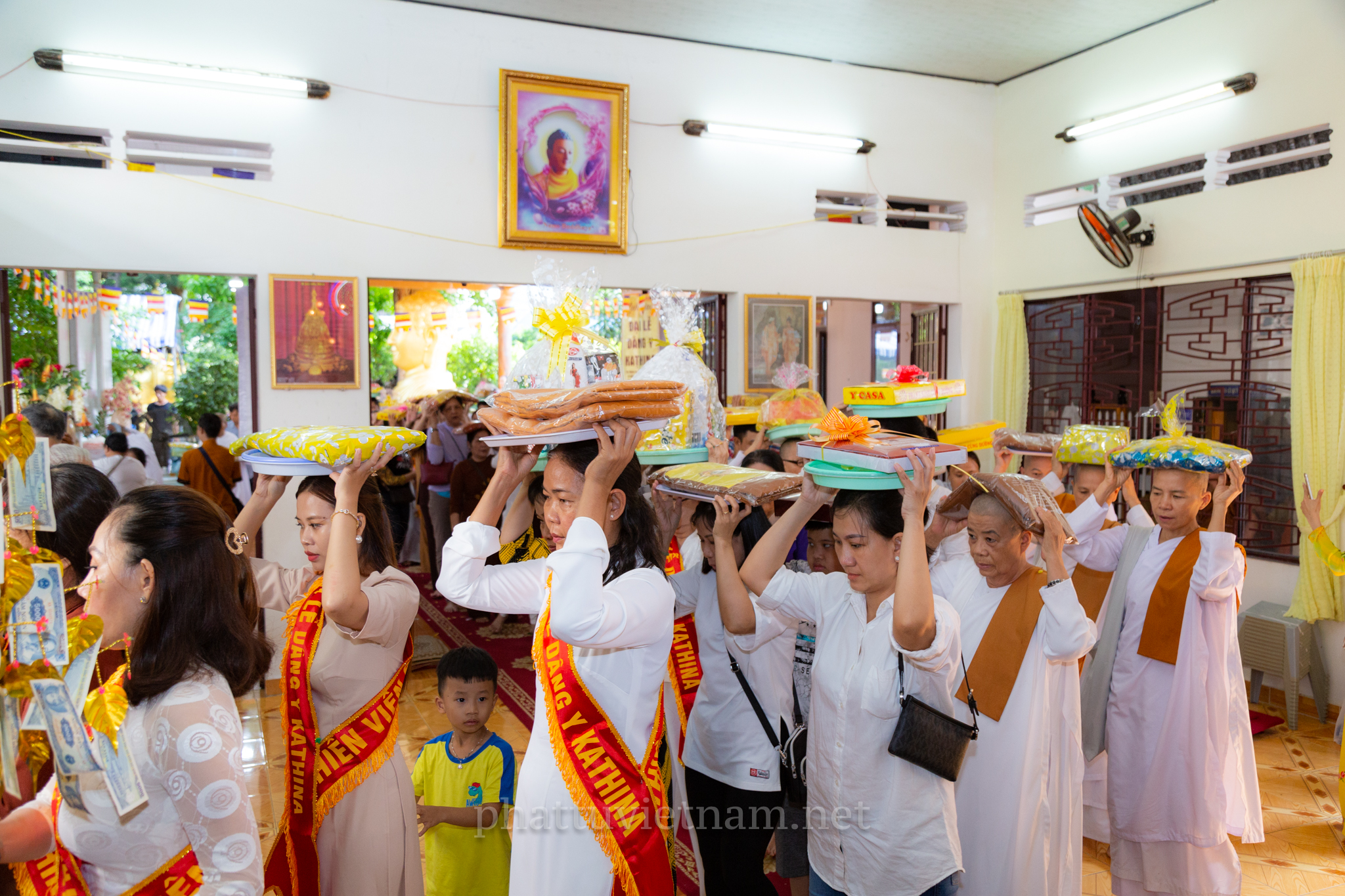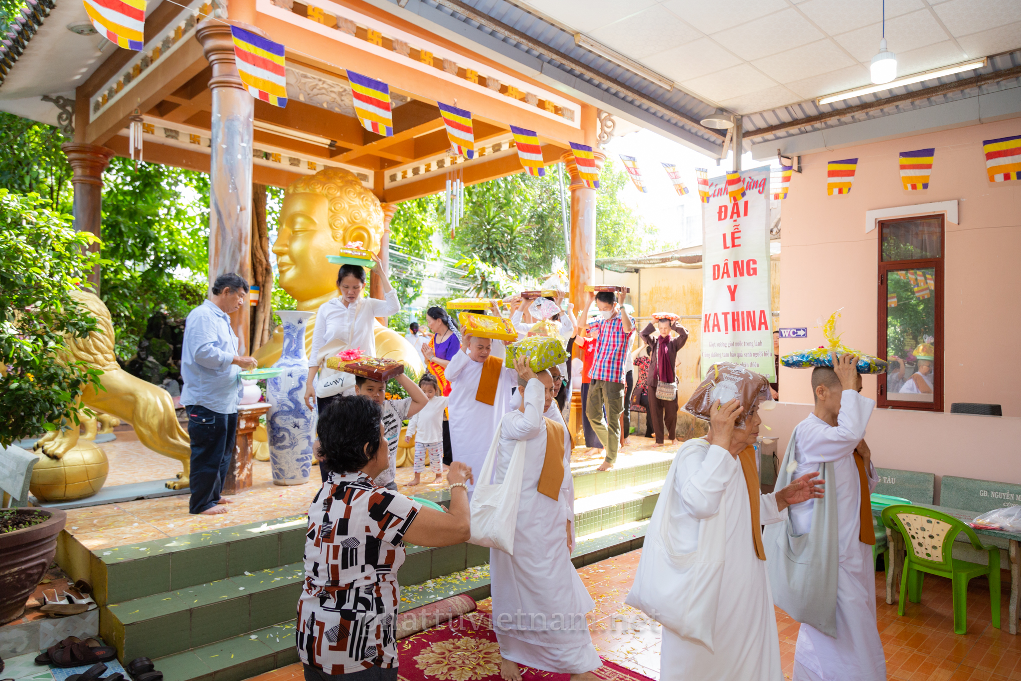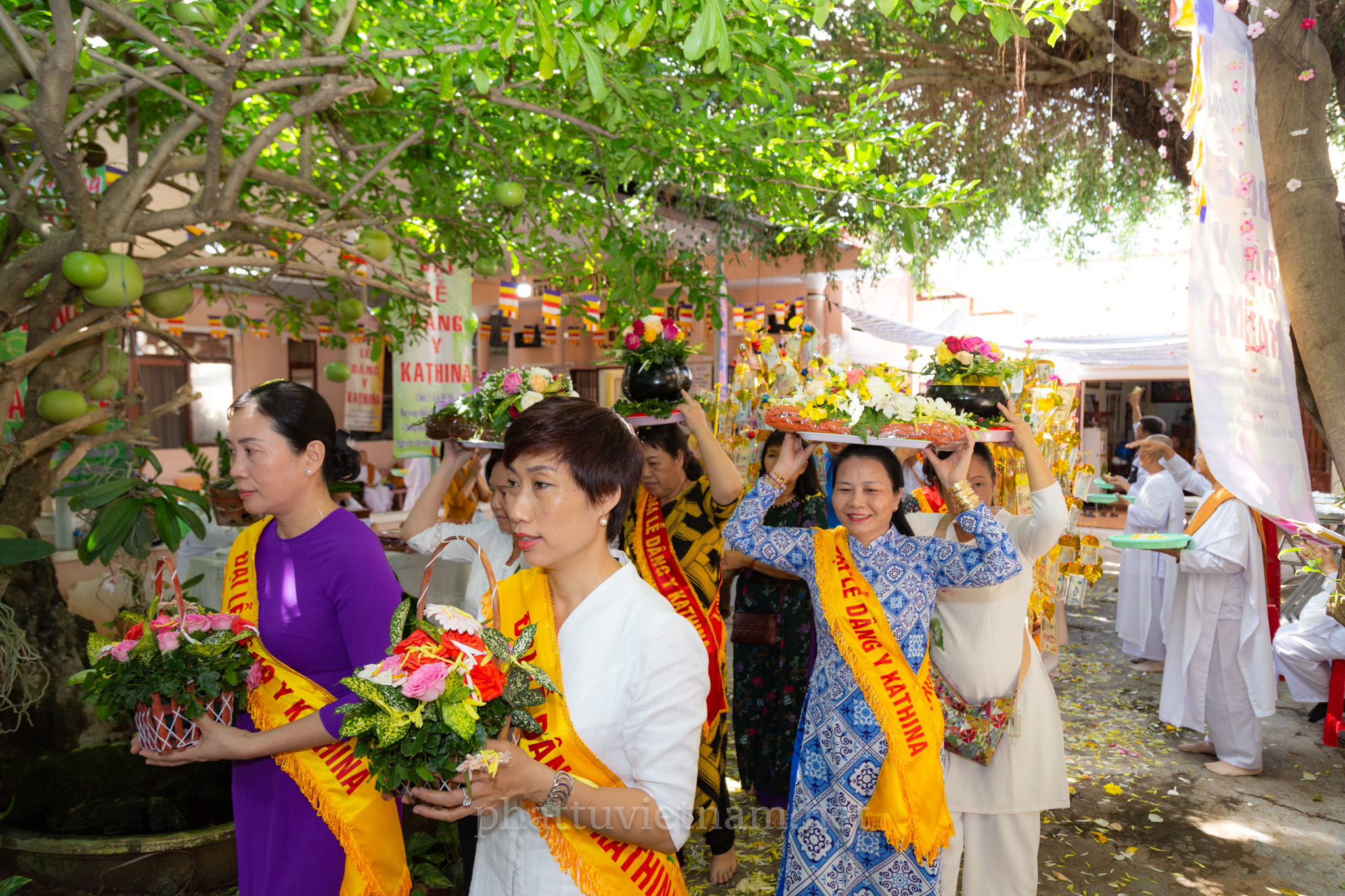 Tiếp đó, các Phật tử đội y, bát cùng tứ vật dụng đi 3 vòng khuôn viên thiền viện và hoan hỷ với phước báu cúng dường Đại lễ dâng y Kathina.