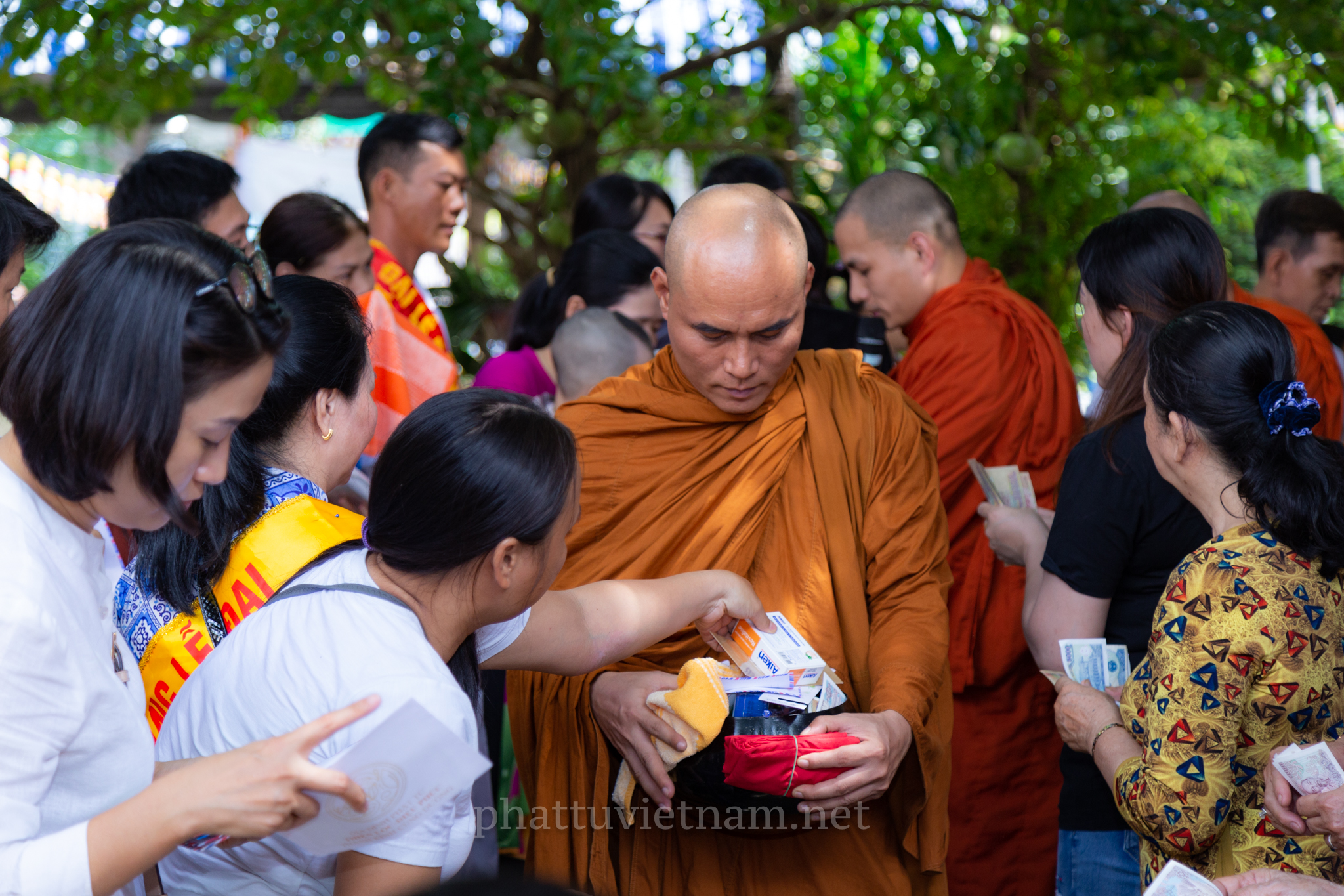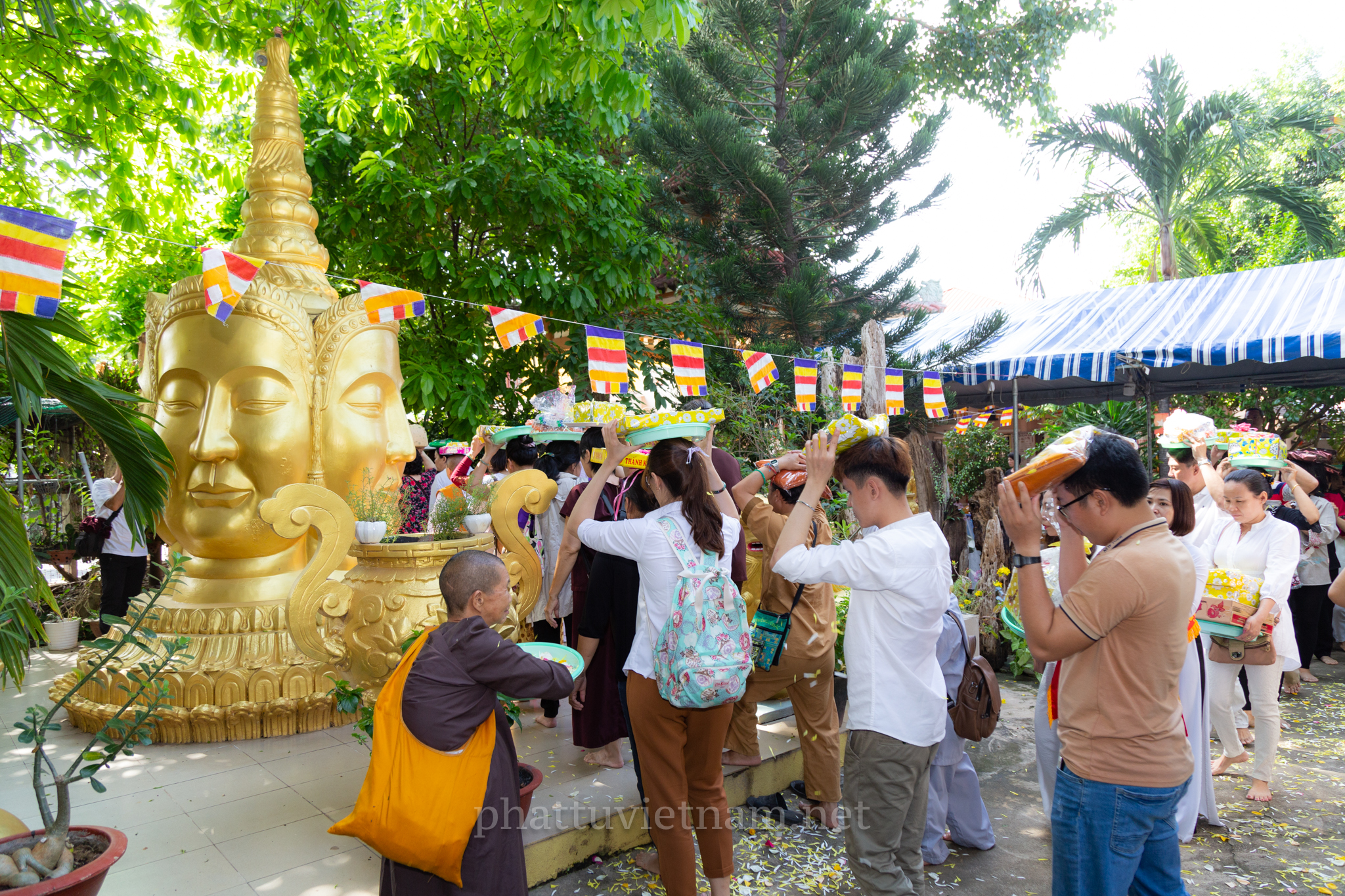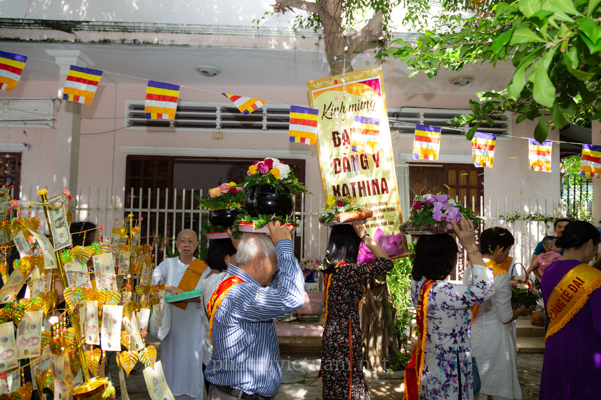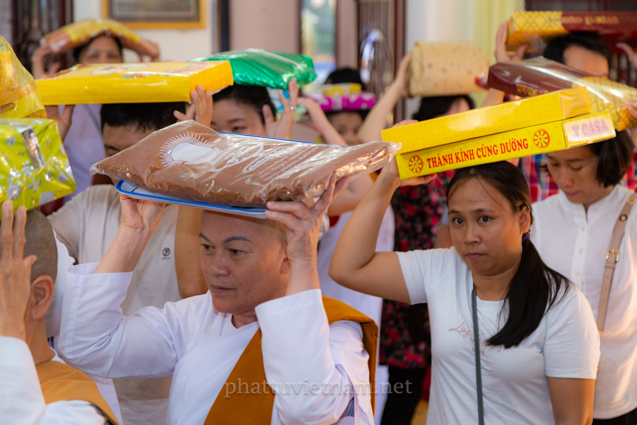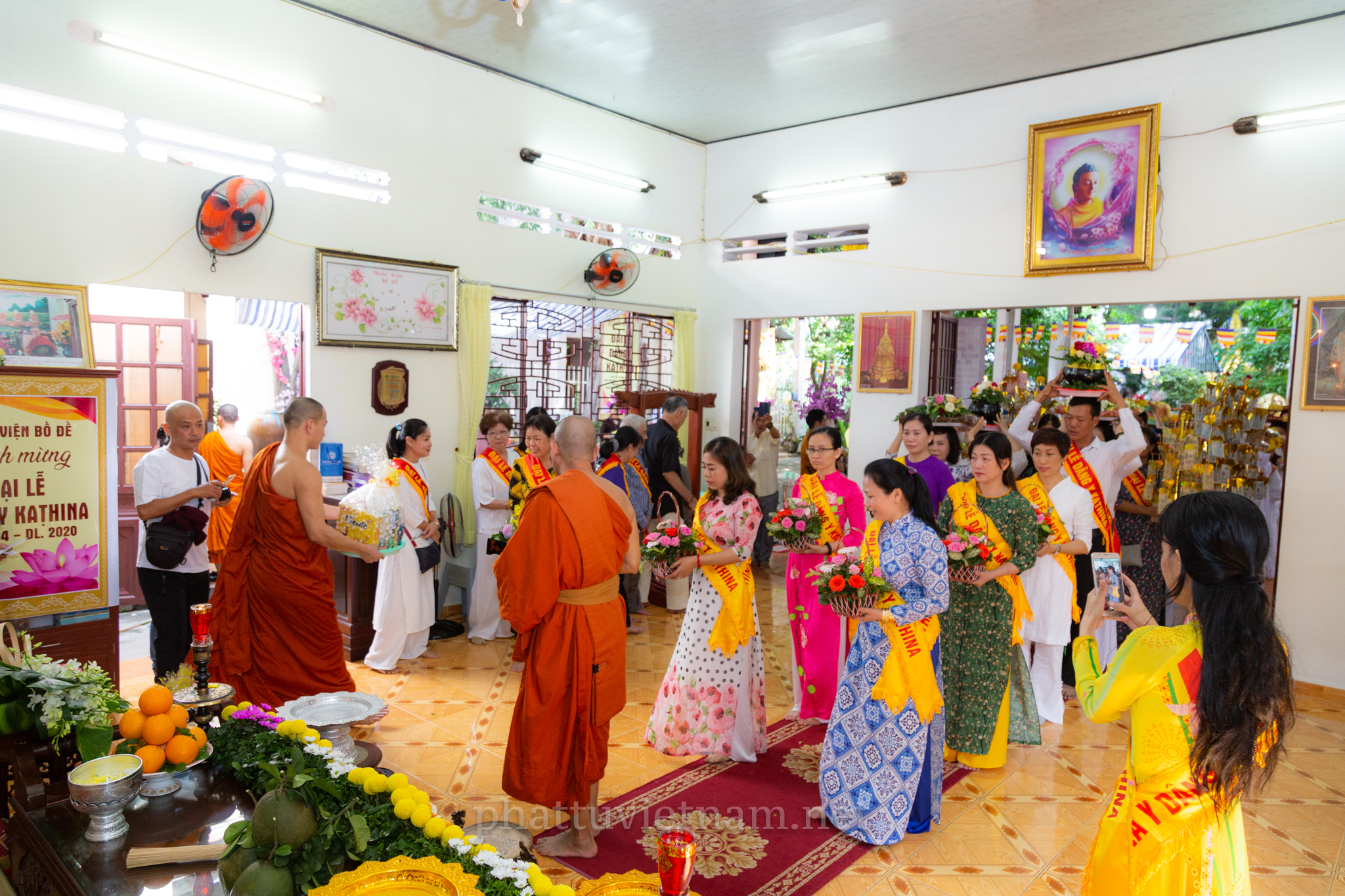 Tiếp đó, các Phật tử đội y, bát cùng tứ vật dụng đi 3 vòng khuôn viên thiền viện và hoan hỷ với phước báu cúng dường Đại lễ dâng y Kathina.