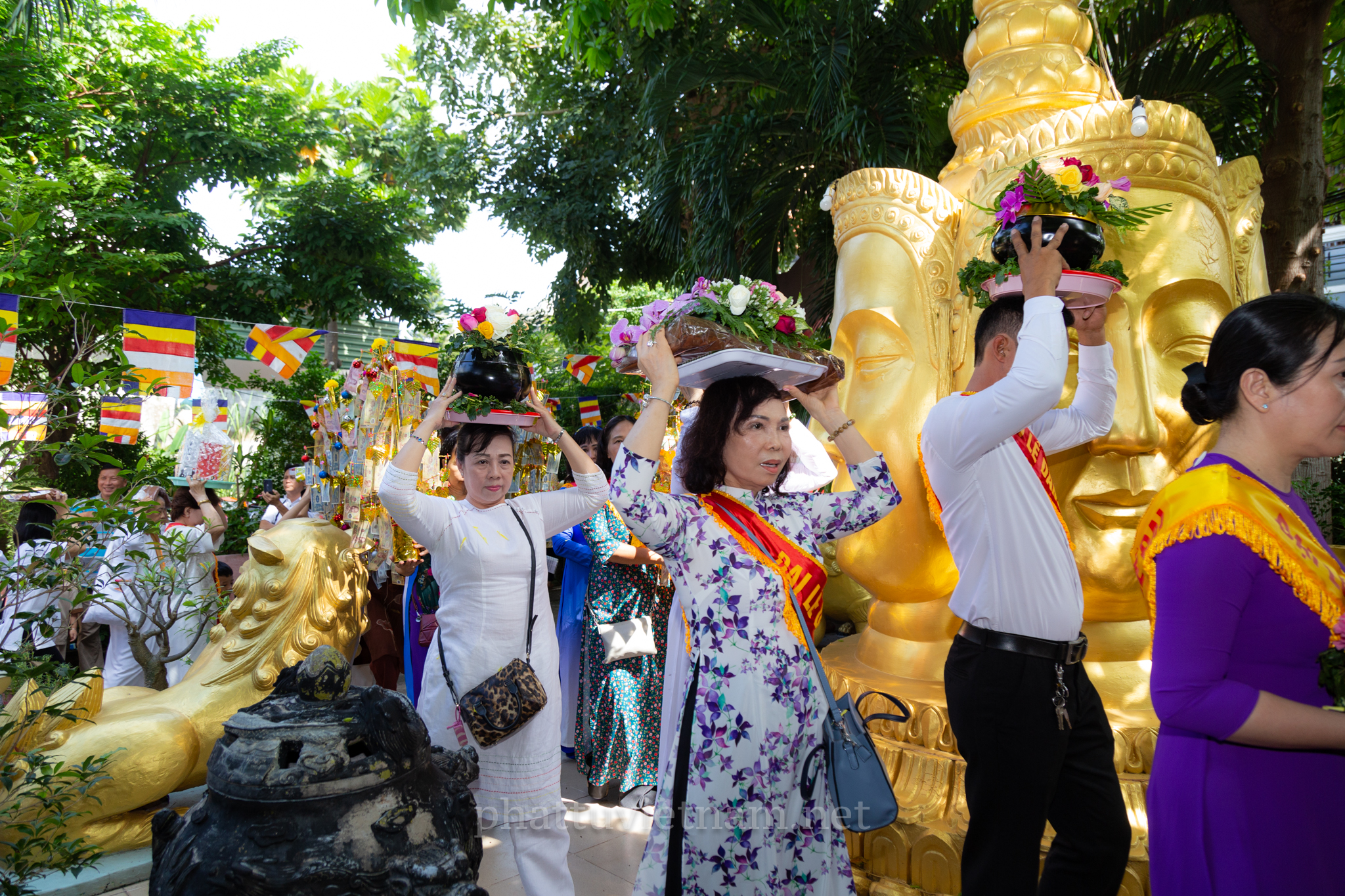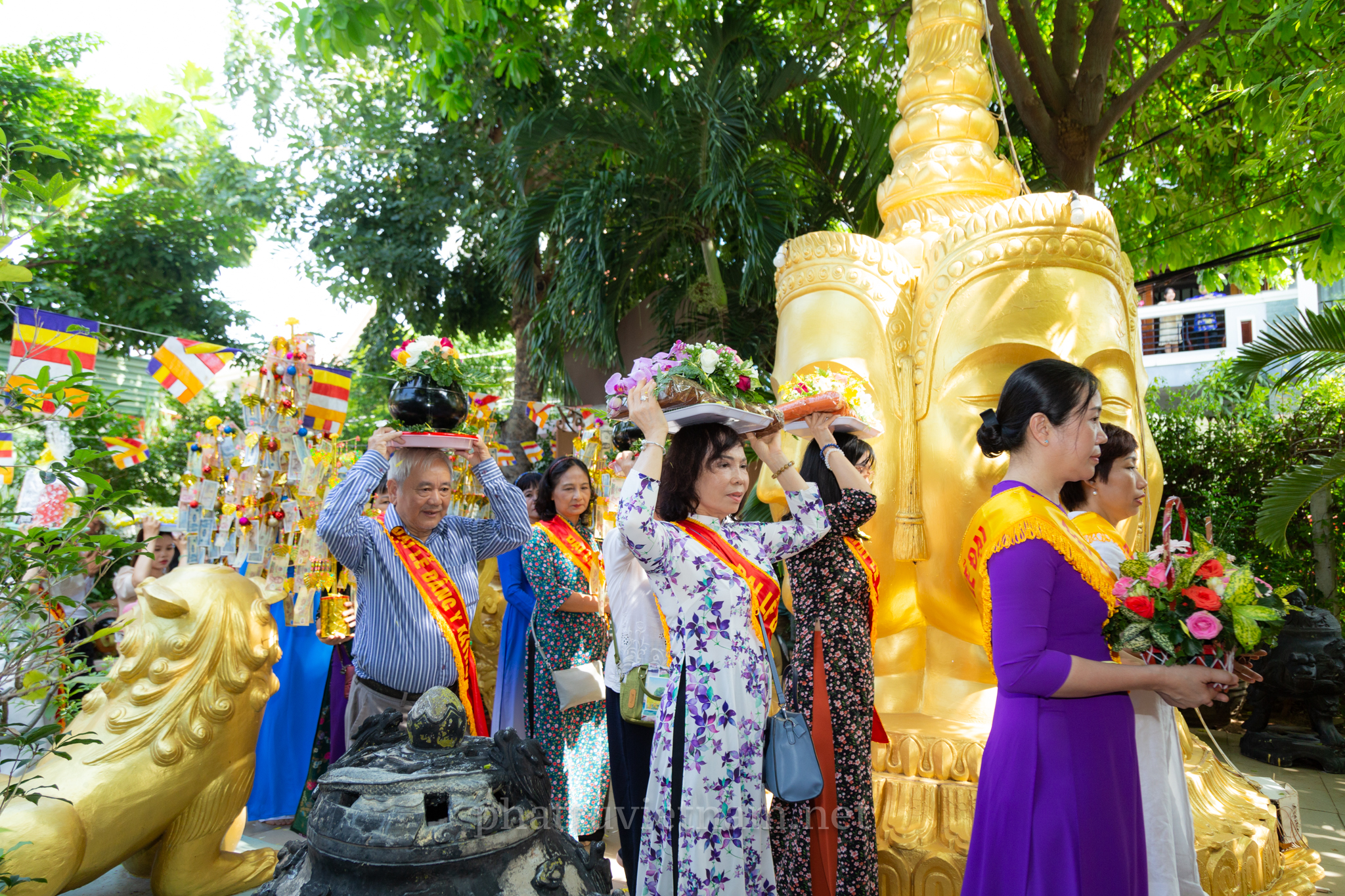 Thực hiện nghi thức đội y, bát và lễ phẩm cúng dường nhiễu ba vòng khuôn viên thiền viện