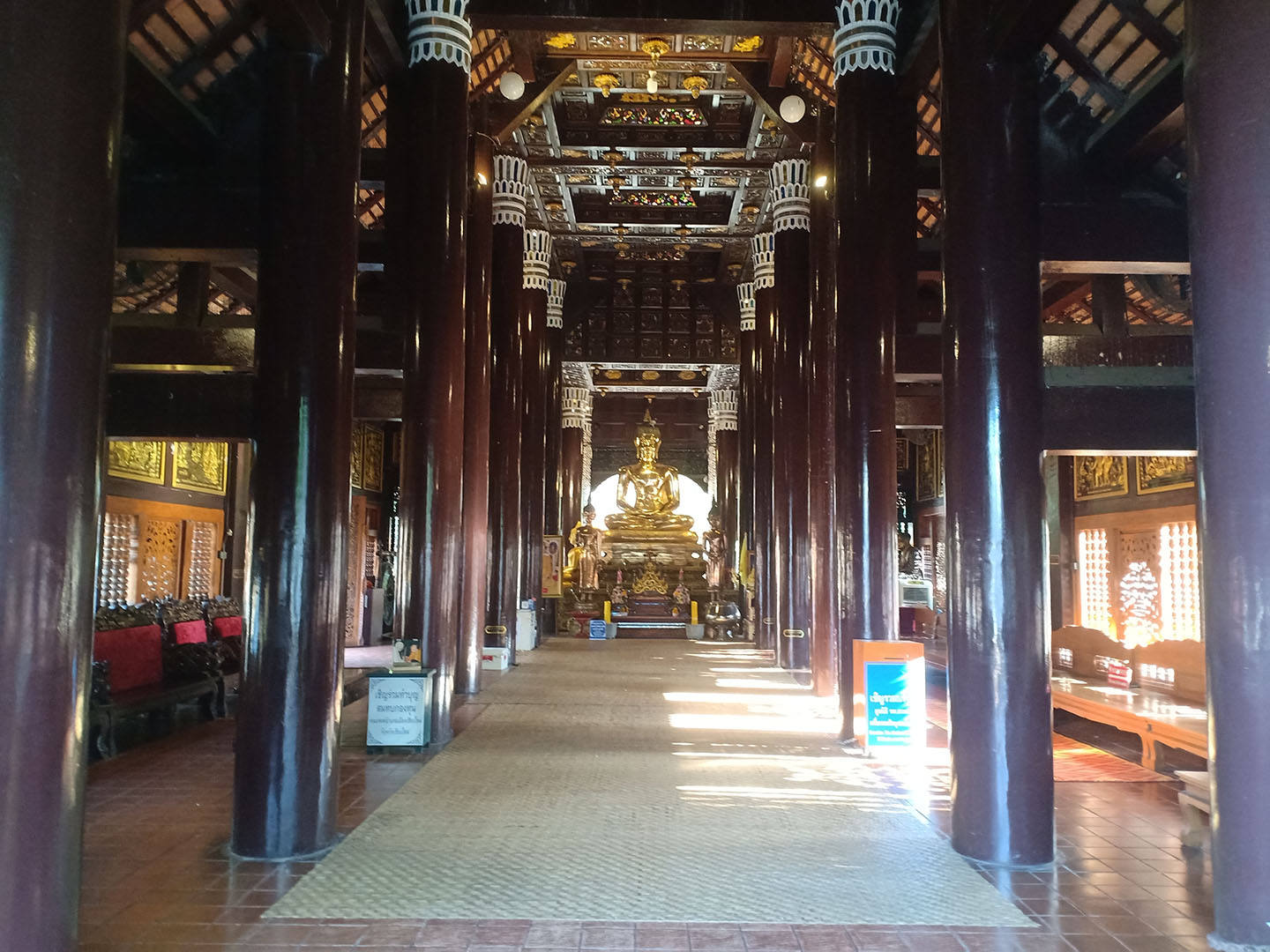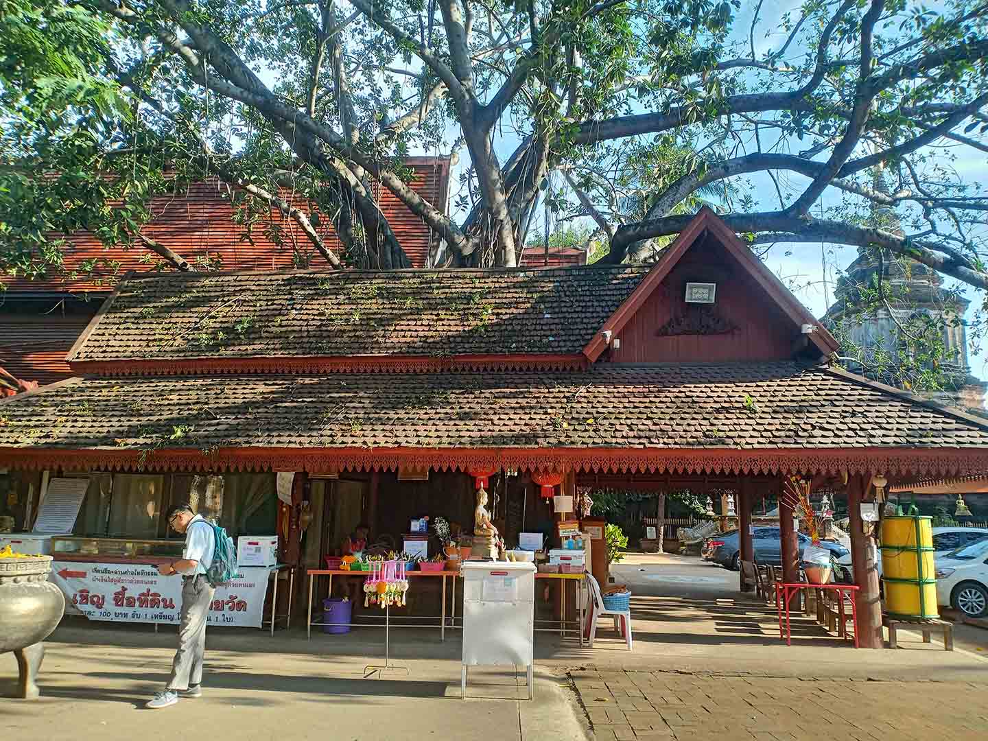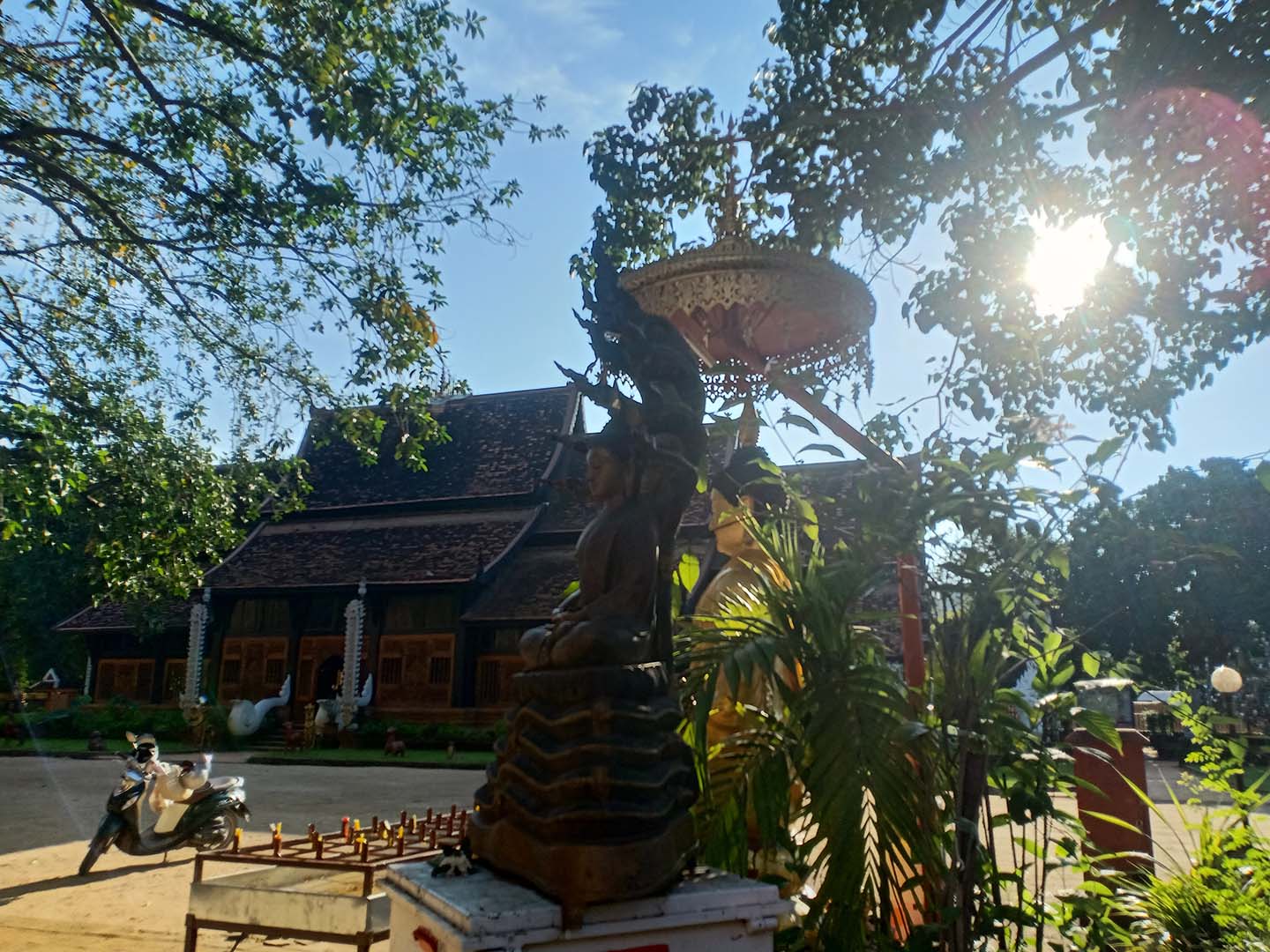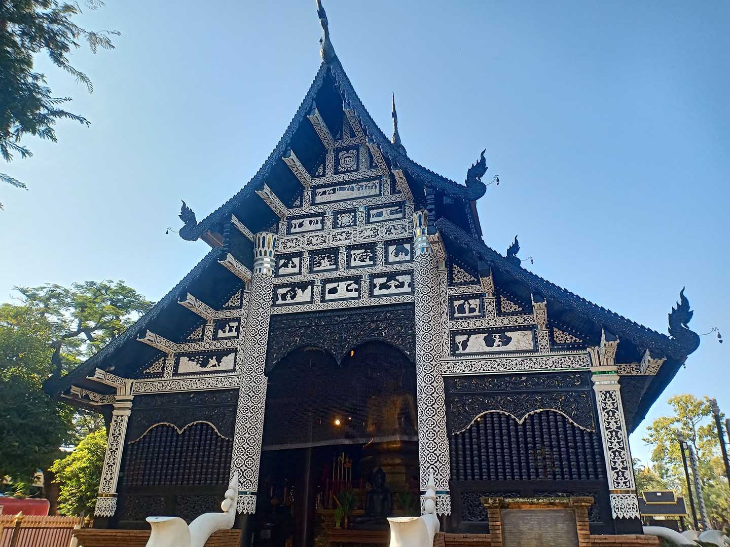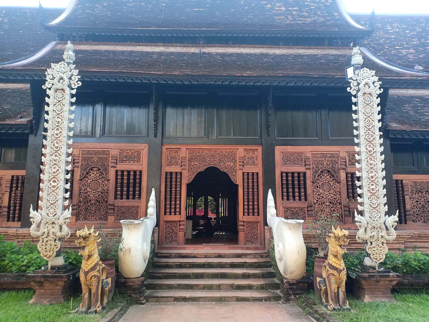 Công trình bằng gỗ được xây dựng theo phong cách kiến trúc Lanna truyền thống của người dân địa phương. Lối vào phía trước có hai con rắn khổng lồ Naga trong thần thoại. Ảnh: Thanh Thu
