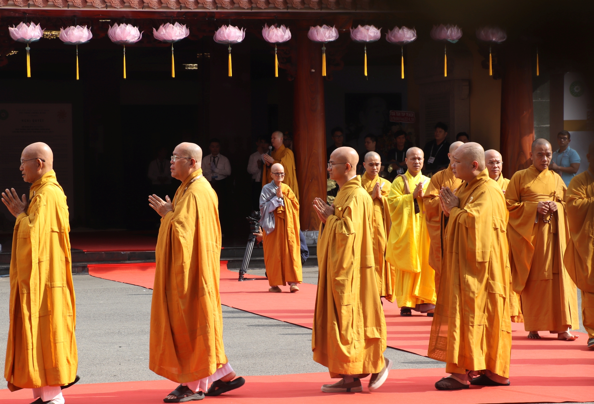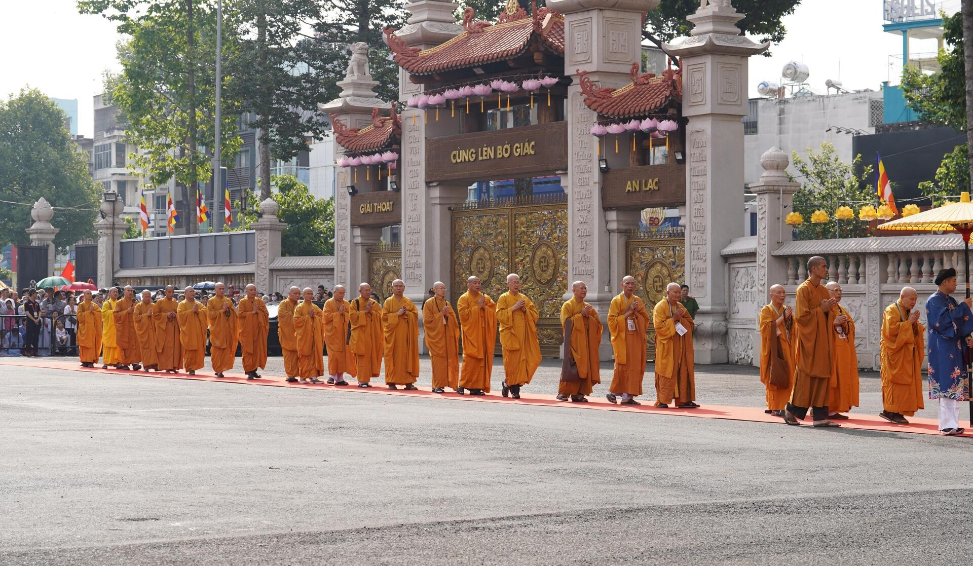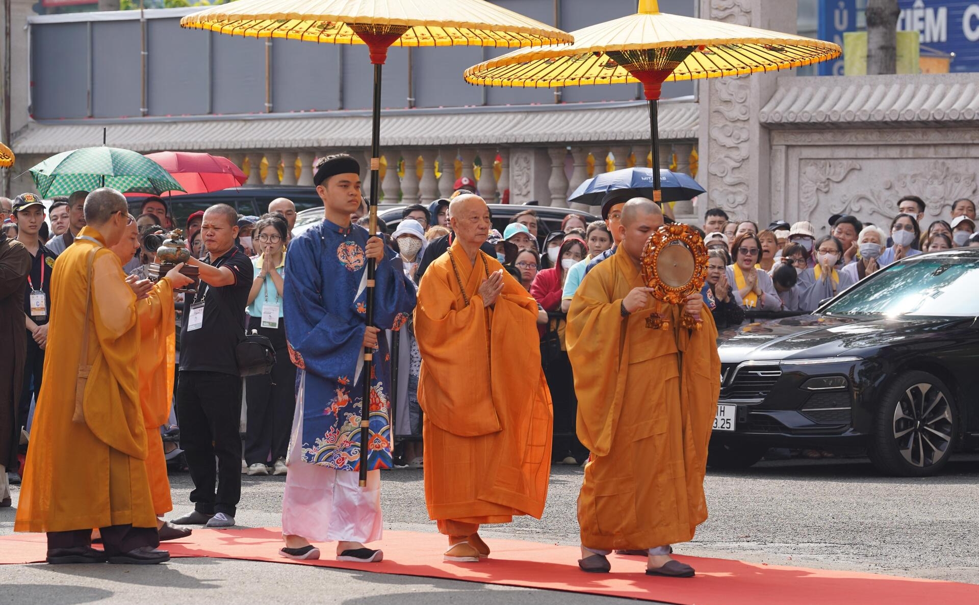 Lễ cung thỉnh diễn ra trong không khí trang nghiêm. Từ sớm, đông đảo Phật tử và người dân đã đến đứng bên ngoài để có thể chứng kiến buổi lễ.