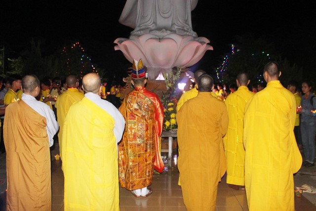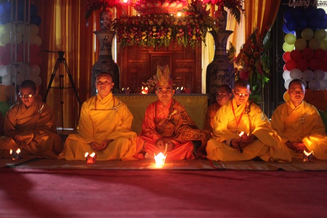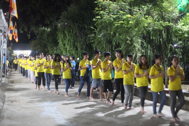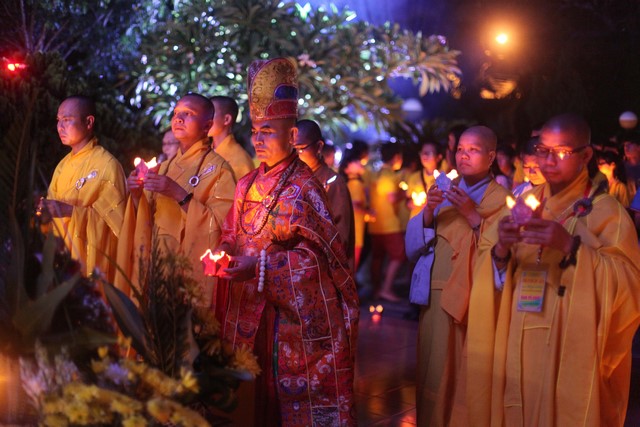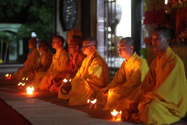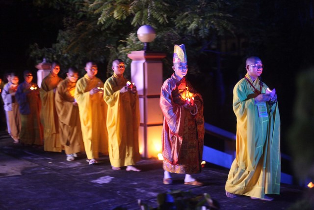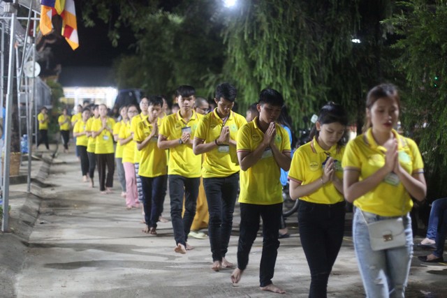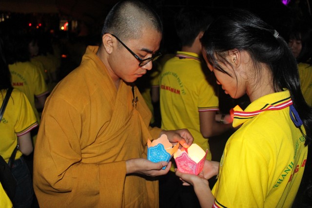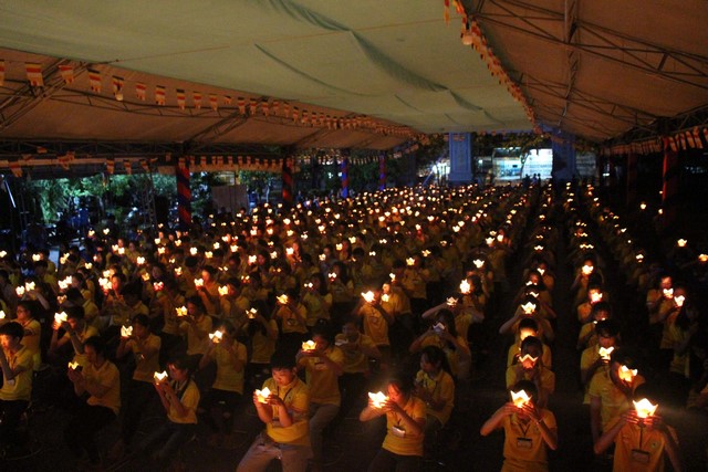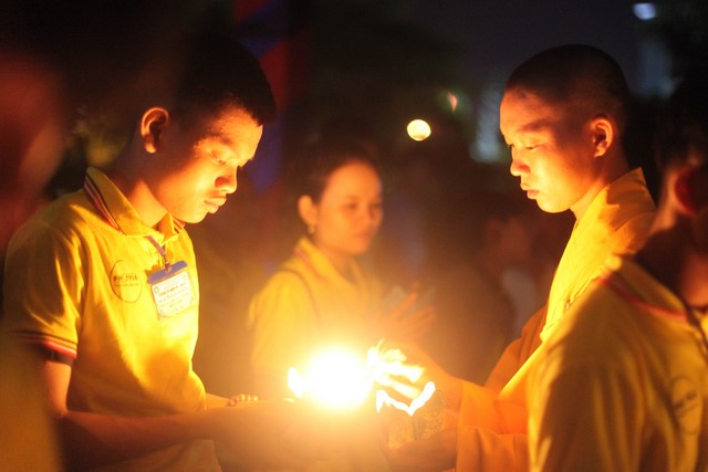 Gần 1.000 ngọn nến được BTC phát cho mỗi khóa sinh. Nhạc niệm Phật vang lên trầm bổng càng góp phần làm không gian hội trường thêm trang nghiêm và tràn đầy đạo vị. Tất cả đèn điện được tắt đi để buổi lễ tăng thêm nguồn xúc cảm và sinh động. Hết thảy khóa sinh được các anh chị chúng phó hướng dẫn xếp thành từng hàng thẳng ngay ngắn, chuẩn bị cho buổi lễ truyền đăng.